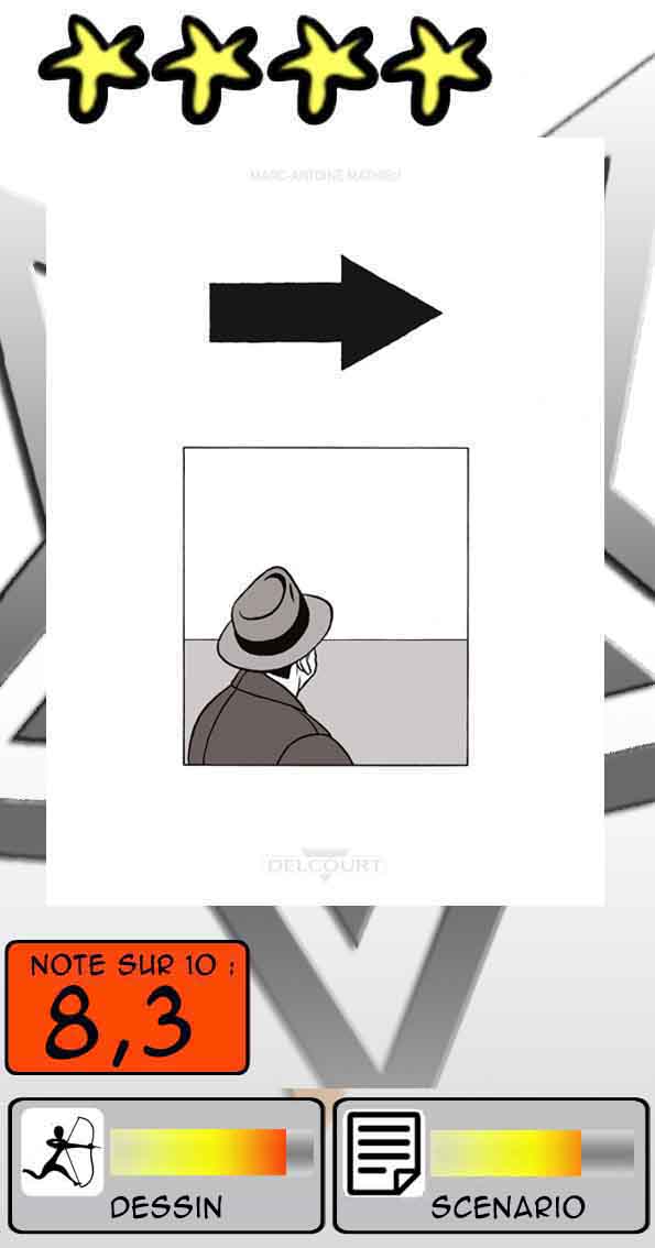Rien que pour le soin apporté à l’édition, je ne peux que relever ma note. Le tirage a été complètement adapté à la thématique (le sens, illustré par la flèche), et comme l’histoire est muette, les rares caractères vont jusqu’à se diluer, en incrustation discrète sur la couverture ou convertis en cryptogrammes fléchés sur la page d’introduction, seule concession à l’alphabet latin. On a ainsi entre les mains un objet étrange, à la blancheur candide, qu’on pourrait définir comme une BD oubapienne doublée d’un superbe livre d’art graphique.