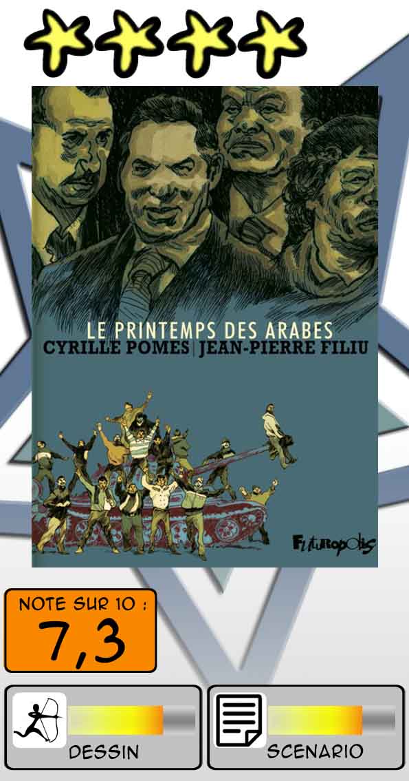 En une centaine de pages, les auteurs ont réalisé un panorama du fameux « Printemps arabe », qui avait mis en ébullition tout l’arc sud-méditerranéen en 2011, déclenchant alors les espoirs les plus fous de peuples assoiffés de liberté et lassés de leurs dictateurs. De son coup de crayon assuré, tout en déchiquetures, Cyril Pomès a su représenter ces événements comme une puissante sarabande à la fois joyeuse et violente, qui, tel un tsunami, a balayé en un rien de temps des régimes que l’on croyait installés pour de longues années.
