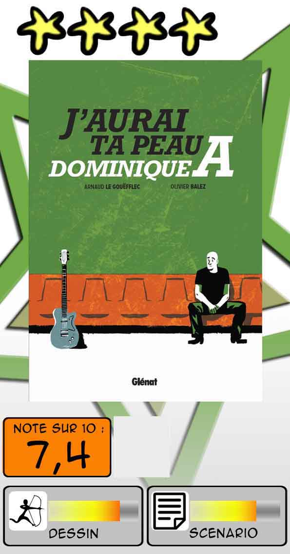 « Il ne faut pas souhaiter la mort des gens, ça les fait vivre plus longtemps. ». Quand on est l’auteur de tels textes, comment s’étonner de recevoir un courrier anonyme menaçant de vous faire la peau ? En même temps, quand on n’a pas la notoriété de Lady Gaga, on peut se dire surpris d’être menacé par un dingue… J’ai trouvé très originale l’idée de départ, consistant à faire d’un chanteur existant le personnage central d’un thriller sarcastique. Dominique A, personnalité très discrète à l’écart de l’arène frivole des people, ne manque pas lui-même d’exprimer sa surprise et sa gêne en préface, « obligé de faire bonne figure auprès de [ses] amis que ça faisait marrer. » Et marrant, pour sûr ça l’est… La présence de Philippe Louxor Katerine, « copine » du chanteur à la scène comme à la ville, ajoute une touche loufoque à ce récit peu conventionnel. Tout comme le fan éperdu, sosie plus vrai que nature de son idole, qui le suit comme son ombre, ne faisant que renforcer le malaise du sieur A.