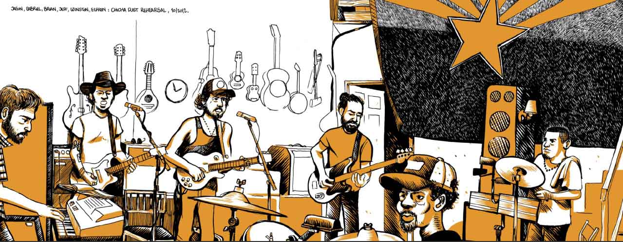 Dans un style évoquant les comics alternatifs US, l’auteur nous invite à le suivre dans ce reportage présentant des portraits de musiciens talentueux biberonnés à la country et quasiment inconnus dans leur pays, des musiciens dans la galère tentant de subsister grâce aux tournées qui coûtent souvent plus cher qu’elles ne rapportent… Heureusement pour eux, le salut est venu d’Europe où ils sont régulièrement invités à se produire dans des festivals. D’autres sujets sont abordés : la politique, les armes à feu, l’immigration mexicaine – Tucson est à quelques miles de la frontière, enclave progressiste dans un état ultraconservateur, où peut s’exprimer la résistance de certains face aux discours généralisés de repli et d’autodéfense. Il y a aussi le désert environnant et ses cactus variés dont les épines tranchantes ne sont quant à elles justifiées que par les rigueurs du climat. Et enfin, la fête des morts du 4 novembre, la All Souls Procession, où tout le monde est grimé en squelette, une tradition héritée de l’époque où l’Arizona appartenait encore au Mexique. Car à Tucson, ville festive s’il en est, la mort et les vautours ne sont jamais loin, le jaune terreux de cette bichromie soignée étant aussi là pour nous rappeler la proximité du brûlant Sonora.