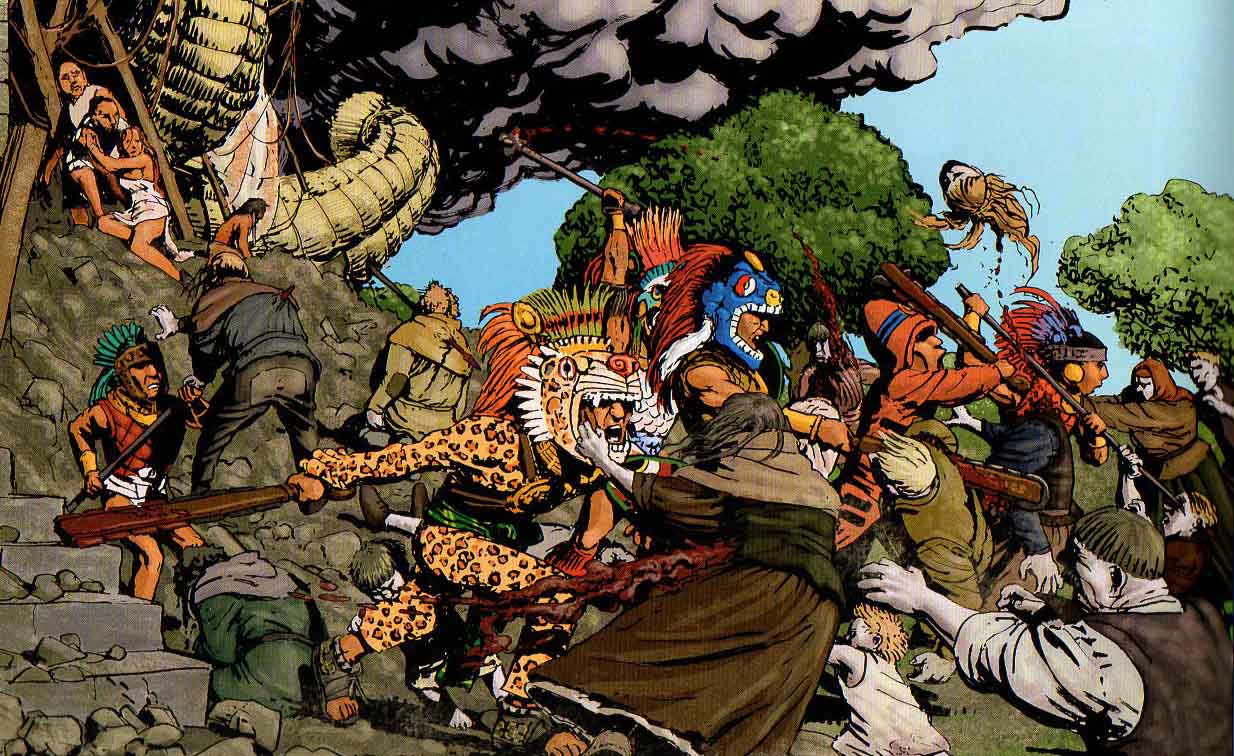 Cette uchronie permet la rencontre de deux civilisations au XXIe siècle, celle d’une Europe demeurée à l’état médiéval et celle des « Inkas », sous un angle inversé par rapport à la réalité historique officielle, ce qui donne lieu à une alchimie étonnante et détonante. Ainsi, par un effet de contraste saisissant, on a d’un côté l’Europe plongée dans une atmosphère sombre et mortifère depuis les ravages de la peste du XIVe siècle. De l’autre une civilisation Inca très avancée (ils entretiennent des relations étroites avec les Chinois et ont inventé le dirigeable !) qui s’épanouit dans une flamboyance colorée, tout en assumant sa violence aussi bien dans les cérémonies sacrificielles, les guerres avec les peuples voisins (Aztèques et Mayas) ou les conspirations de palais. Car on l’a bien compris, il n’est pas question ici de faire dans l’angélisme… Conformément à cet effet de miroir et sans vouloir rien révéler de l’intrigue, ce sont les Incas/Inkas qui vont découvrir l’Europe dans ces conditions très particulières, mais contrairement aux conquistadors, ils n’ont aucune visée conquérante. Chargé de ramener à son père le secret de l’immortalité, le prince Manco se contente d’observer et de tenter de nouer des liens avec ces étranges « autochtones », en opposition toutefois avec son belliqueux général Yaocoyotl.