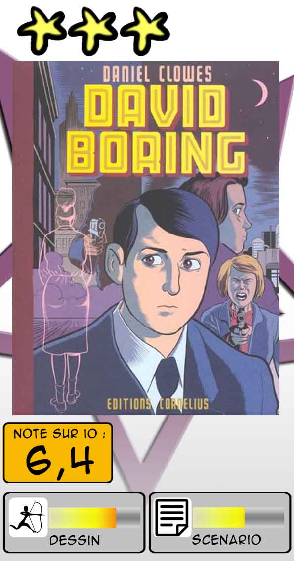 Faire un résumé de cette histoire au scénario tortueux relève du défi. Et je confesse mon manque de motivation pour m’y atteler. D’ailleurs, rien que le nom du héros éponyme, ou plus exactement antihéros, montre clairement qu’on n’est pas là pour s’éclater. Il est fort probable que Daniel Clowes se soit inspiré de sa propre expérience, misant à fond sur l’analyse introspective, et du même coup, sur la patience du lecteur. L’histoire est lisible, assez réaliste par rapport à ce que j’ai pu lire du même auteur (par exemple Comme un gant de velours pris dans la fonte, sorte de folie hallucinée mise en images), encore faut-il se souvenir des nombreux personnages, mais là n’est pas la question. Les digressions et autres états d’âme de Clowes sont bien trop nombreux à mon sens pour faire en sorte que David Boring (l’œuvre) fasse ressortir quelque chose de vraiment marquant. On ne retiendra que quelques images fugaces sans arriver vraiment à savoir où l’auteur a voulu en venir, si ce n’est évoquer de façon erratique ces thèmes éternels que sont la quête de l’âme sœur et du désespoir amoureux.
