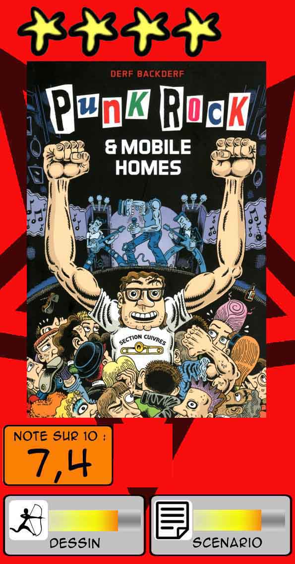 Tirés de faits réels et de souvenirs personnels de Backderf, Punk Rock et Mobile Homes se veut aussi et surtout une évocation joyeuse et foutraque, qui rappelle par bien des aspects les Fabulous Freak Brothers, avec ce sympathique Baron qui au départ n’avait pas toutes les cartes en main pour se sortir d’un milieu sordide (sa famille vivait chichement dans un parc de mobile homes, avec pour seule distraction la télé et la picole), mais parvint à se distinguer par sa personnalité baroque et son aplomb hors du commun. De façon surprenante, l’auteur renforce par son graphisme vertical si particulier le côté hilarant de l’histoire, alors qu’il lui conférait une touche vaguement inquiétante dans Mon ami Dahmer. On ne peut pas dire que ce soit joli – d’ailleurs Backderf s’en moque bien de faire joli – mais c’est stylé et soigné, et au final on se dit que ces personnages rectangulaires pas trop sexys collent parfaitement à cet univers de contre-culture.