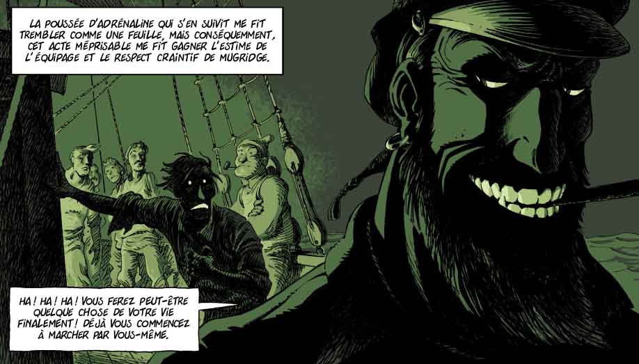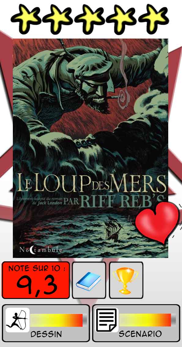 N’ayant pas lu le roman de Jack London, je peux difficilement faire la comparaison, toujours est-il que cette adaptation du Loup des mers m’a autant impressionné par le forme que par la fond. J’ai beaucoup apprécié le dessin nerveux et racé de Riff Reb’s, qui retranscrit parfaitement la puissance démoniaque de Loup Larsen. Le choix chromatique est très réussi, avec un ton dominant pour chaque chapitre. L’ouvrage bénéficie d’un cadrage et d’un tempo parfaits, et l’auteur utilise avec brio l’ombre et la lumière. C’est juste magnifique à regarder.