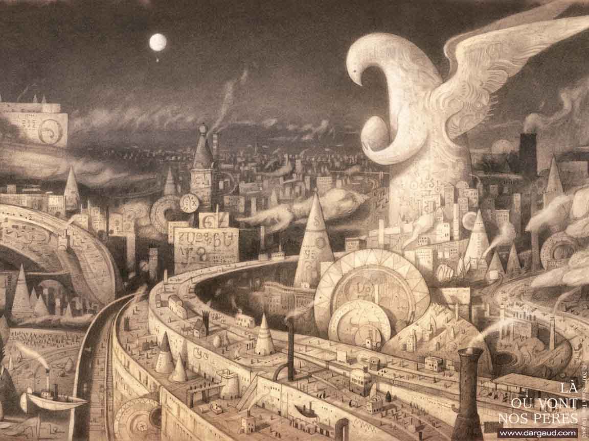 Subjuguant. C’est le premier mot qui me vient à l’esprit pour parler de cette œuvre très originale. Tout d’abord par la beauté du dessin extrêmement soigné dans des tons monochromes allant du gris sale à une sépia très lumineuse. L’imagination et les trouvailles de l’auteur font le reste. Celui-ci confère une portée universelle au mythe de la terre promise, avec une dimension onirique tout à fait étonnante qui peut dérouter à la première lecture. L’histoire commence en effet de manière plutôt sombre et réaliste (la patrie) pour évoluer dans un univers merveilleux et quasi surréaliste (la terre d’accueil), truffé d’objets et de créatures extraordinaires, ainsi que de symboles mystérieux. De cette façon, l’auteur a parfaitement su représenter comment un monde nouveau pouvait être d’une étrangeté absolue aux yeux d’un immigrant. L’absence de textes n’est absolument pas gênante, au contraire, cela aurait presque paru redondant dans cette histoire avant tout visuelle. Elle comporte d’ailleurs une telle richesse qu’à mon avis on peut la relire plusieurs fois sans problème et y découvrir de nouveaux éléments qui n’auraient pas sauté aux yeux à la première lecture.