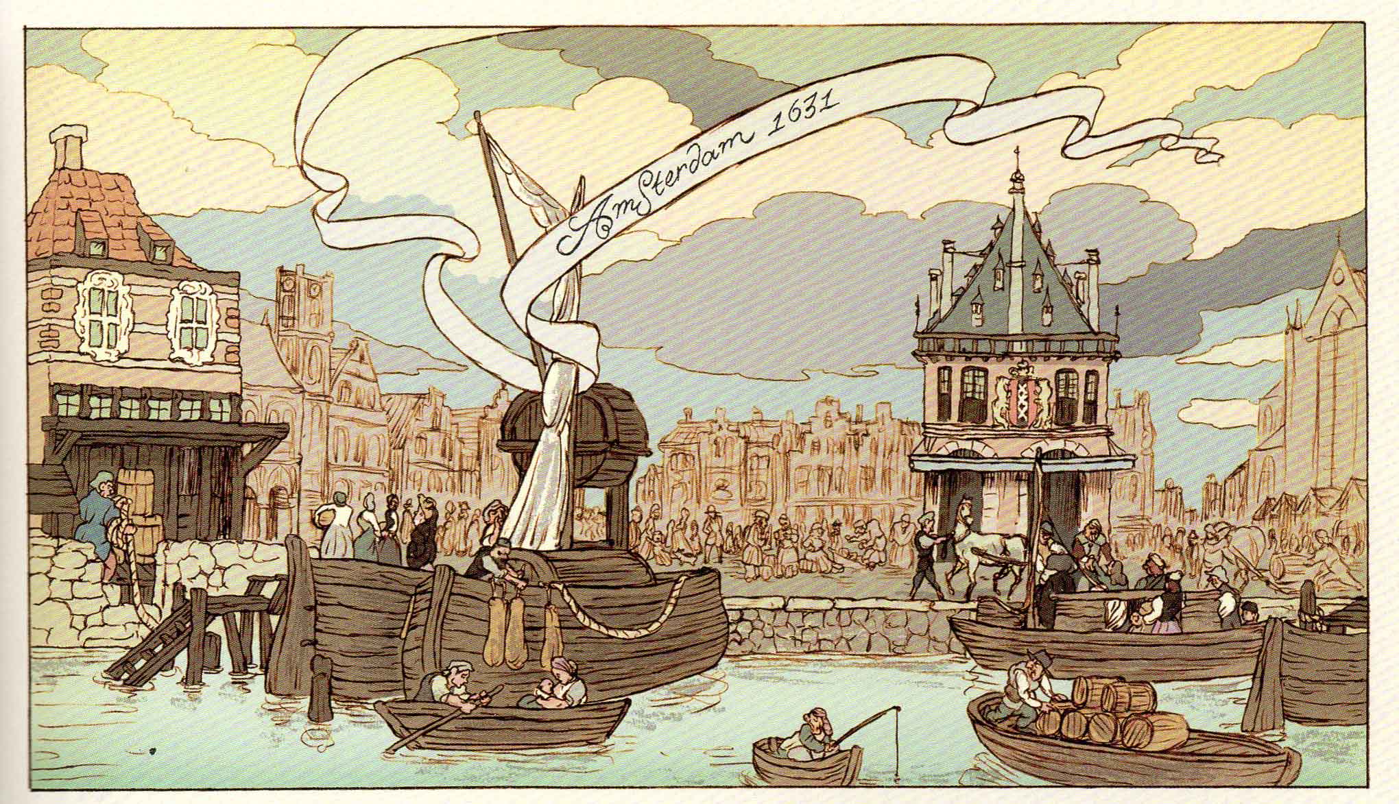 Hollandais tout comme Rembrandt, Typex, alias Raymond Koot, a mis cinq ans pour réaliser cette œuvre de commande du Rijksmuseum. Quasiment inconnu dans le monde du 9ème art, Typex est issu du courant alternatif de la BD et de l’illustration, et cette production va sans doute le faire accéder à la reconnaissance internationale. L’auteur n’a pas cherché à imiter l’art du maître flamand, ni même à se plier à un académisme de circonstance, aussi bien dans le dessin que dans la narration, au risque de désorienter le lecteur. Son trait un rien désuet semble mû par une liberté totale, tout en mouvement, alternant entre l’esquisse la plus rudimentaire et les scènes plus détaillées, grouillantes de vies et de personnages, où prime un grotesque rabelaisien. Ces derniers rappellent par leurs attitudes et leurs expressions le style du célèbre caricaturiste Daumier. Pour la couleur, Typex a judicieusement opté pour des tonalités sobres à dominante brune pour évoquer l’Amsterdam du XVIIe siècle.