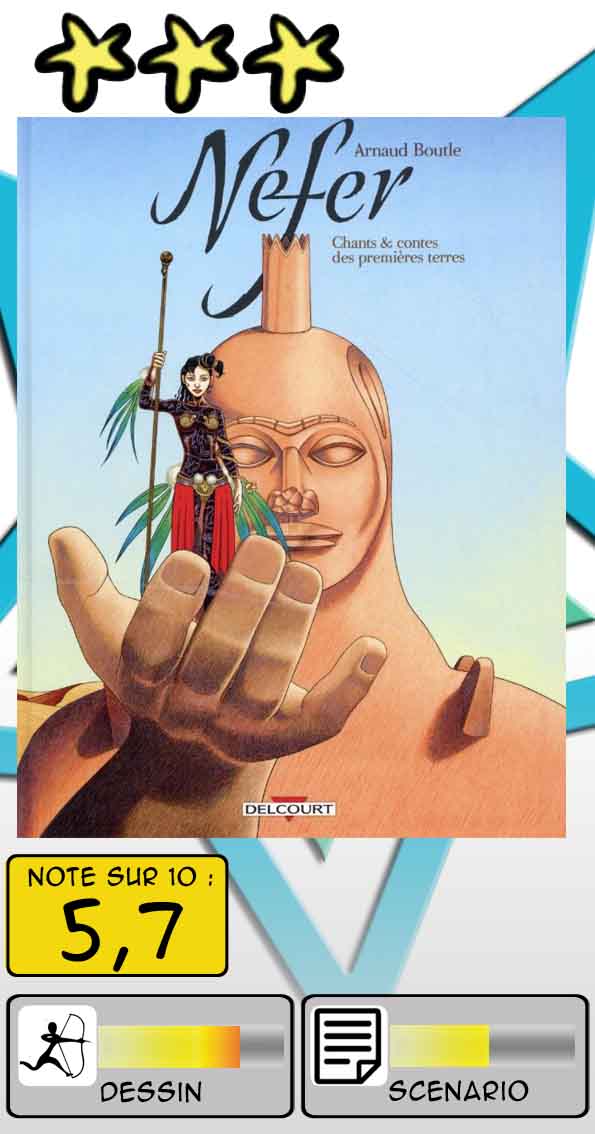 Nefer ne manque pas de charme, même si le scénario a les défauts de ses qualités : à trop se vouloir original, et il l’est malgré une fin convenue, mais s’avère un peu alambiqué voire poussif, en particulier dans la seconde partie. De même, le côté fourre-tout mystico-biblique, avec ses emprunts discutables au chamanisme et aux légendes primitives, n’est pas sa qualité première. Cependant, les arguments du premier paragraphe peuvent justifier la lecture de ce conte, voire un achat pour les fêtes de fin d’année. Car incontestablement il y a du beau dans cette BD.