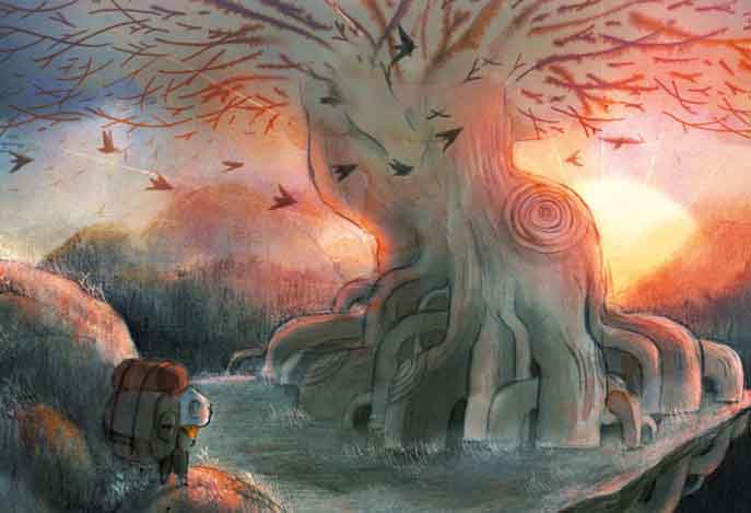 Si ce conte magnifique s’adresse d’abord aux enfants, il pourra aisément toucher les plus grands grâce à la poésie qui le traverse. Dans le cas présent, on peut même parler de souffle poétique, ne serait-ce que parce qu’il parle de ce vent capable de « soulever les montagnes »… Au cours de sa quête, l’enfant croisera un arbre, des cailloux et un bouquetin, transformés ici en créatures fantastiques, avant de rencontrer le vent en personne. Et c’est en cela que réside en grande partie l’originalité de l’ouvrage. Les choses ne sont pas représentées telles qu’on s’y attend : par exemple, l’arbre apparaît comme une grosse guirlande légère et cotonneuse, et le vent comme un oiseau géant et translucide dont le souffle est symbolisé par des nuées d’ailes, le tout sous le pinceau talentueux d’Amélie Fléchais qui a réalisé des planches superbes et enchanteuses.