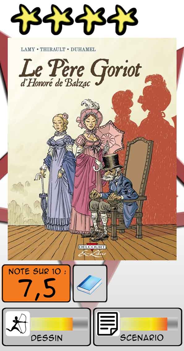 La reconstitution des décors et des costumes est irréprochable, et si l’approche ne peut être qualifiée d’audacieuse, elle est tout à fait louable de par son attachement à respecter l’histoire originale et l’ambiance de l’époque. Quelques adaptations et raccourcis ont bien sûr été nécessaires pour coller au mode de lecture dynamique imposé par la BD (notamment la scène ajoutée du duel entre Vautrin et le frère de Victorine), mais de façon mesurée, les auteurs n’ayant pas tenté d’être plus royalistes que le « roi » Balzac en imposant à tout prix leur patte. Mise en couleur soft et graphisme sobre et précis conviennent tout à fait bien au récit. Les dialogues tirés du roman mêlés à des onomatopées propres à la BD prouvent que la belle écriture peut très bien s’accorder au 9ème art.