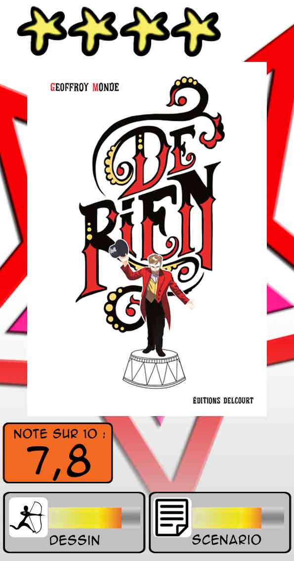 Tout commence avec le tirage. La couverture, elle en jette avec son titre en caractères néo-art nouveau imprimés en embossage. Trois couleurs noir, rouge, jaune, sur fond blanc. La classe. De jolies fioritures pour du « rien ». Mais De rien, ça n’est pas rien. Une sorte de grand spectacle penchant vers le minimalisme, avec un titre terminatif en guise de présentation, et ce monsieur Loyal saluant le public avant le fermer de rideau. Au dos, une citation de l’auteur lui-même : « C’est par le langage de l’absurde que l’on peut le mieux évaluer et mettre en lumière l’écart tragi-comique séparant la nullité de signification du réel de la géniale boursouflure sémantique de notre monde. » Monsieur Monde use-t-il de ce vocabulaire sociologique un rien pompeux pour se rendre intéressant ou pratique-t-il le 45e degré ? En admettant la seconde hypothèse, c’est très habile et il est probable que les plus snobs tomberont dans le panneau, tout comme ceux qui croient qu’un cépage réputé et une belle étiquette font un bon vin… Autre décalage parmi tant d’autres, le chapitrage. Chaque saynète est introduite par une illustration en noir et blanc du lieu, vide de présence humaine et où est censée se dérouler l’action, avec à chaque fois le titre dans le même style art nouveau, tandis que les personnages, en couleurs, évolueront ensuite sans cases ni décor autour d’eux. Une trouvaille graphique originale, on pourrait presque dire, du grand art.