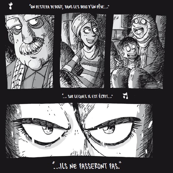 La mise en page, on s’en doute, est très libre, avec des cases tracées à main levée, donc de traviole. Quant au dessin, il est à l’image du propos. De veine humoristique, le trait noir et blanc se fait nonchalant ou nerveux selon le degré de gravité (impossible de ne pas représenter les morts liés à cette guerre…), parfois plus descriptif quand le ton est « journalistique ». Contre toute attente, cela fonctionne, et on peut dire que Zerocalcare se sort brillamment de cet exercice périlleux.
