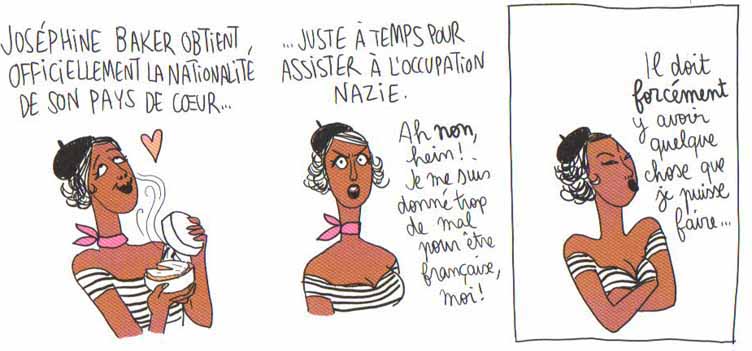 Ces quinze femmes « de tête », qui ont existé à toutes les époques et sur tous les continents, ont droit chacune à un chapitre plus ou moins long, conçu de manière synthétique, telle une fiche Wikipédia mise en images. On apprend notamment que Joséphine Baker (la plus connue sans doute) n’était pas que la danseuse espiègle de cabaret telle qu’on la décrit souvent, mais aussi espionne pour la résistance. Le trait minimaliste de Pénélope Bagieu est assorti d’un humour léger et discret, comme si cette dernière avait voulu se mettre en retrait par rapport à ces personnalités qu’elle cherche ici à réhabiliter. Chaque chapitre se clôt par ailleurs avec une élégante illustration en double page, qui, bien plus que la bande dessinée, permet d’admirer le talent graphique de l’auteure.