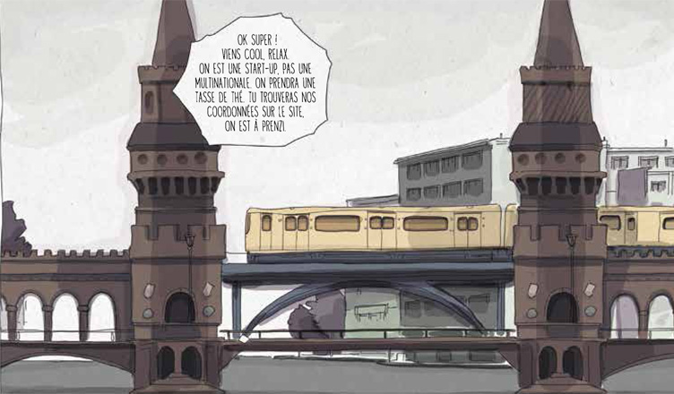 Le trait apaisé et nonchalant d’Alberto Madrigal, associé à la clarté de ses couleurs pastels, colle parfaitement à l’ambiance berlinoise. Et comme Berlin 2.0 se rapproche parfois du carnet de route, le dessinateur utilise à bon escient le cadrage pour souligner les spécificités architecturales, culinaires ou sociales (par exemple, se déchausser dans le logement de son hôte) de la capitale allemande.