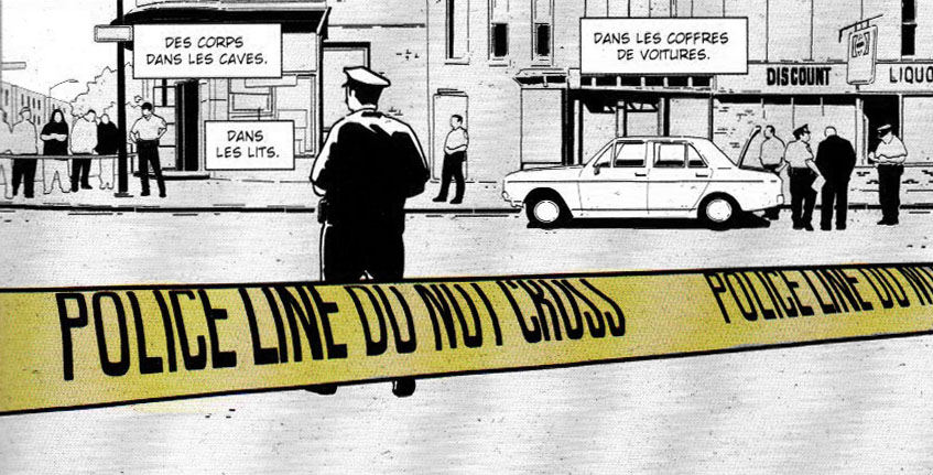 Après une échappée peu concluante vers la fantasy (Mongo est un troll), Philippe Squarzoni revient à un genre qu’il affectionne et pratique avec talent : le documentaire. De son trait sobre et réaliste, il met en images les textes – très bien écrits – de l’auteur américain, toujours avec ce même sens du découpage et de la précision affutés, nous faisant pénétrer un univers urbain à la violence sous-jacente, loin des clichés hollywoodiens et autres flics à Miami… Le quotidien de ces flics est plus dominé par la routine que par les poursuites en voitures (ou même à pied), inexistantes ici. D’ailleurs, reflétant bien tout cela, la colorisation a été réduite à un niveau quasi-monochromatique dans une palette désaturée, à l’exception du rouge pour les tâches de sang, ce qui permet de mieux se concentrer sur le propos. Ici, nous sommes à Baltimore, grande cité portuaire du nord-est des Etats-Unis qui n’invite pas spécialement au rêve. Et comme on est dans un documentaire, c’est une voix off qui accompagne la narration la plupart du temps, les dialogues restant assez rares. On y apprend qu’une enquête est souvent un travail de longue haleine (quand le meurtre est un whodunit, à l’inverse d’un dunker), avec des indices souvent peu nombreux et durs à déchiffrer, et qu’il faut toute l’intuition et la persévérance de ces hommes pour identifier les assassins, face à la pression de la hiérarchie.