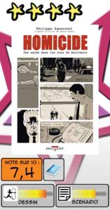 Homicide saura passionner tous les adeptes de séries et de romans policiers, plus particulièrement ceux privilégiant l’intellect à l’action pure. Et malgré cette impression d’inertie visuelle, l’auteur sait insuffler ce qu’il faut de tension pour retenir le lecteur, fasciné par un univers où la mort semble s’amuser d’une partie de cache-cache interminable. Projet à la fois ambitieux et minutieux de Squarzoni, cette série est prévue en cinq tomes.
