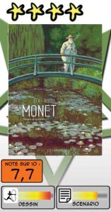 Plutôt bien construit, le récit, dominé par la voix off du peintre, s’ouvre sur les derniers moments de sa vie avant d’enchaîner sur un long flashback depuis l’enfance. Salva Rubio s’attache à l’homme en tentant de cerner la passion qui l’animait, car il l’a bien compris : Monet était voué corps et âme à son art. Cette biographie, fidèle à la vérité historique, est davantage une réussite sur la forme. Le traitement graphique est magnifiquement réalisé, s’imposant comme un hommage brillant au peintre impressionniste, dont le style et les toiles sont souvent évoqués avec brio, sans que soit négligé pour autant un certain réalisme. On a parfois l’impression d’être immergé dans les œuvres du peintre, mais Efa, qui visiblement sait rester modeste, évite de singer bêtement la patte de l’auteur des Nymphéas, ce qui d’ailleurs aurait pu se révéler épineux dans le cadre d’une bande dessinée biographique.
