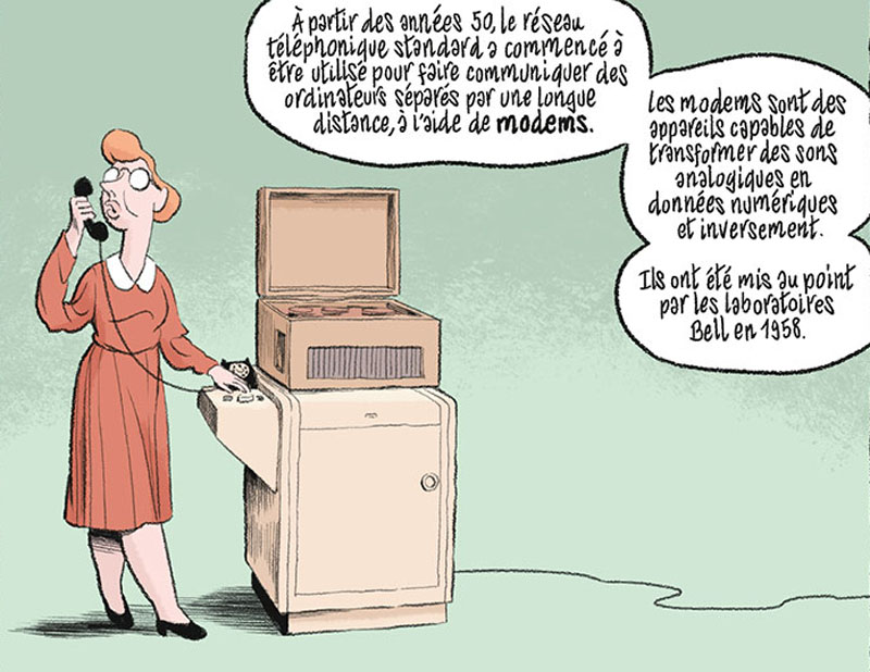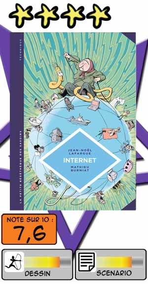 Cela donne une narration très vivante, et le coup de crayon rond et vif de Mathieu Burniat, qui avait récemment mis en images Le Mystère du monde quantique, fait le reste. Le dessinateur s’en sort d’ailleurs beaucoup mieux ici, mais aussi sans doute en partie parce qu’Internet est un domaine qui recèle moins de nébulosités que la physique quantique pour le commun des mortels. Jean-Noël Lafargue développe le thème de façon assez exhaustive, des aspects techniques aux enjeux économiques, de ses bienfaits à ses dérives… Devenu en l’espace de vingt ans aussi vital que l’eau courante, Internet est finalement assez mal connu de par son histoire et son fonctionnement, et cet ouvrage vient judicieusement combler nos lacunes.