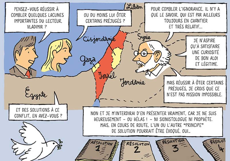 L’ouvrage, par la voix de l’historien Vladimir Grigorieff, tente d’expliquer le conflit en remontant d’abord aux origines, nous livrant les clés factuelles nécessaires à une compréhension globale et raisonnée. D’une certaine façon, il fait appel à la capacité d’empathie de chacun en tentant lui-même de rester le plus objectif possible, se gardant bien de prendre parti pour l’un ou l’autre camp, tout en soulignant l’importance de parvenir à une cohabitation durable et respectueuse. Car, faut-il le préciser, Vladimir Grigorieff est aussi un pacifiste convaincu. Par son dessin minimaliste, Abdel de Bruxelles apporte un peu de légèreté dans la lourdeur de cette discorde, s’inspirant parfois de photos d’actualités et d’archives. Un outil synthétique et très utile pour appréhender un conflit millénaire aux ramifications multiples, dans un état d’esprit optimiste, si tant est que cela soit possible…