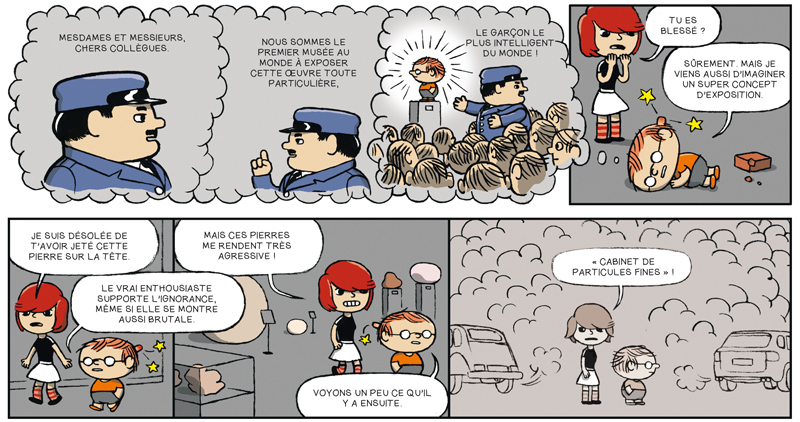Pendant les premières pages, le lecteur est bien disposé voire intrigué, tout à fait enclin à entamer ce voyage au sein du musée avec ces deux enfants. Le trait vaguement inspiré de Charlie Brown laisse supposer un humour pince-sans-rire dans l’esprit cartoon, mélange de gags et de réflexions philosophiques. La trame, quant à elle, semble vouloir se dérouler comme dans un jeu vidéo, où l’on passe constamment d’un univers à l’autre. On sent qu’on est dans l’absurde et que tous les délires sont permis. Jusqu’ici, tout va bien.