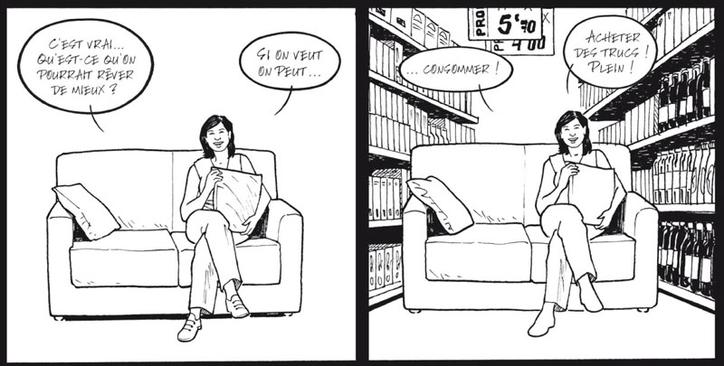 Si ce docu-BD semble reprendre la ligne éditoriale du Monde diplomatique, cela n’est guère surprenant quand on sait que Phillippe Squarzoni est membre d’Attac. Cet ouvrage est un peu une sorte de condensé des articles publiés dans le mensuel, réputé pour son sérieux et ses plumes de renom. Tout en en conservant l’esprit, l’auteur a tenté de relever le défi d’associer des thèses a priori austères au langage plus ludique de la BD. Et globalement, il y parvient plutôt bien, à l’aide d’un trait réaliste et sobre, en noir et blanc, en truffant les pages de références au cinéma (notamment Les Raisins de la colère, Charlie Chaplin, Matrix, Star Wars, Shrek…), en incrustant des titres de journaux et des photos célèbres (ou en les dessinant). Si les illustrations répondent de façon souvent pertinente aux textes, parfois avec un humour à froid et subtil, on pourra objecter que les phases où des personnalités sont interviewées sont un peu monotones (sur deux ou quatre pages on voit juste l’intervenant représenté avec peu de variantes dans les expressions). A cet égard, je ne vois pas bien ce que le dessin apporte…