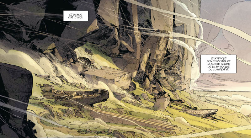 Très efficace dans son cadrage, le dessin réaliste nous donne à voir un univers aride et déchiqueté, composé de paysages grandioses. Les teintes sombres à dominantes brunâtres sont bien adaptées à l’atmosphère anxiogène de cette quête, monotone dans son âpreté mais non exempte de rebondissements narratifs. Restait également la difficulté liée à la représentation graphique du vent omniprésent, que l’auteur a surmontée de façon équilibrée.