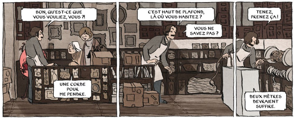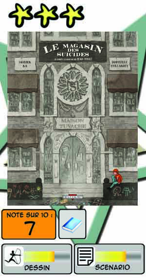 Créer un univers en huis clos (tout se passe dans le magasin) où le désespoir s’impose en norme est une excellente idée de départ permettant à un humour noir et pince-sans-rire de donner toute sa mesure, sans tomber pour autant dans la méchanceté. Les dialogues, d’une extrême drôlerie, m’ont fait pouffer à plusieurs reprises.