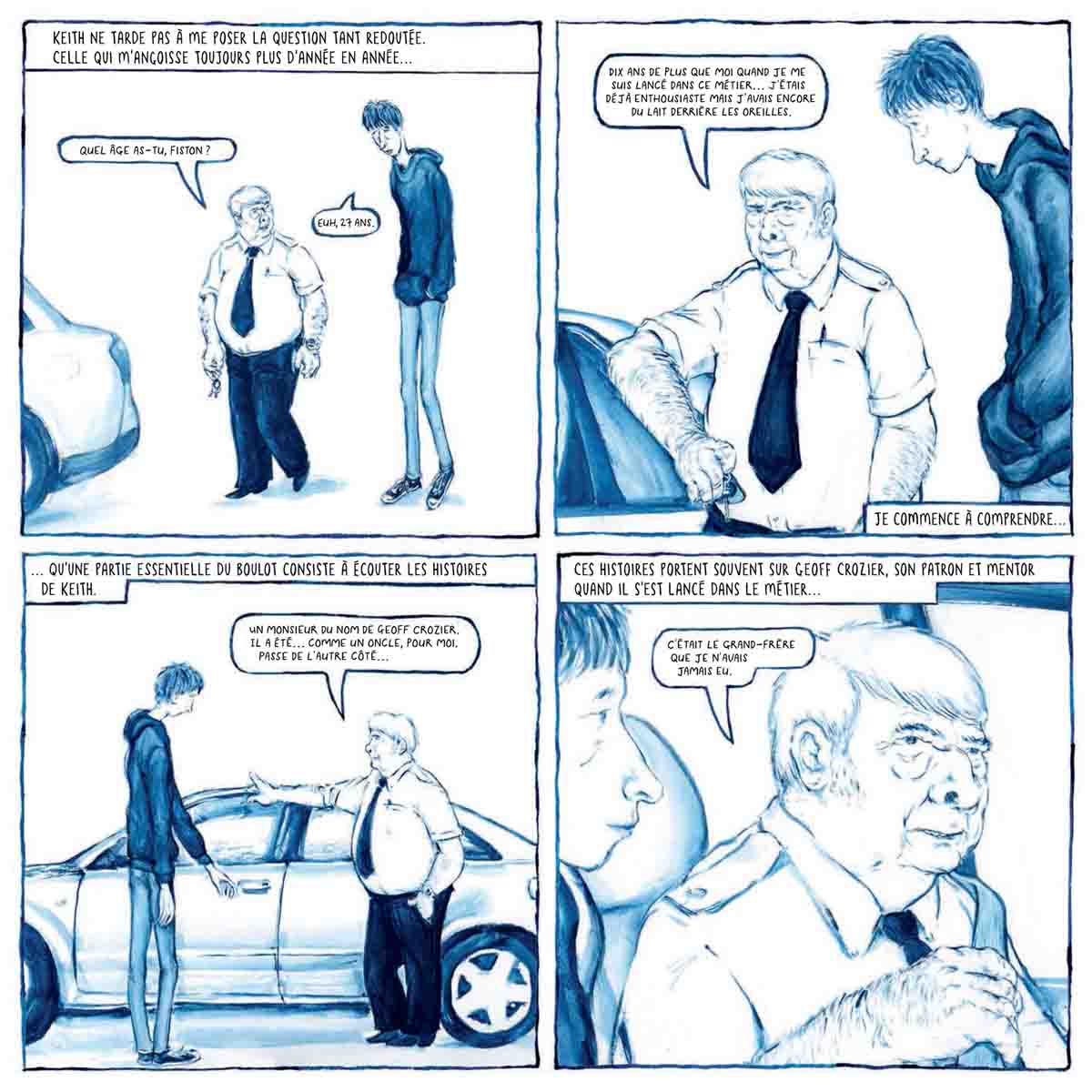 Dessin atypique, narration atypique… si ce roman graphique hyper-réaliste peut au premier abord laisser dubitatif, il finit par embarquer le lecteur à son insu dans ses méandres, ceux d’une réalité des plus ordinaires. Car sous l’œil de Joff Winterhart, ces arrêts sur image des vains va-et-vient de Keith Nutt, accompagné de son confident malgré lui, le jeune Sam, prennent une dimension intrigante et subtilement cocasse, parfois incongrue. Le dessin, pas forcément abouti, reste pourtant détaillé et fait ressortir chez son auteur un sens de l’observation pour le moins développé, avec un trait semi-réaliste au crayonné, axé sur les personnages et leurs aspérités physiques, rarement rendus sous un jour avantageux il faut bien le dire. On n’est pas sur du noir et blanc mais plutôt sur un bleu foncé monochrome, et les couleurs existent même si elles sont rares, comme cela semble aller de soi dans une région de l’Angleterre minée par la crise.