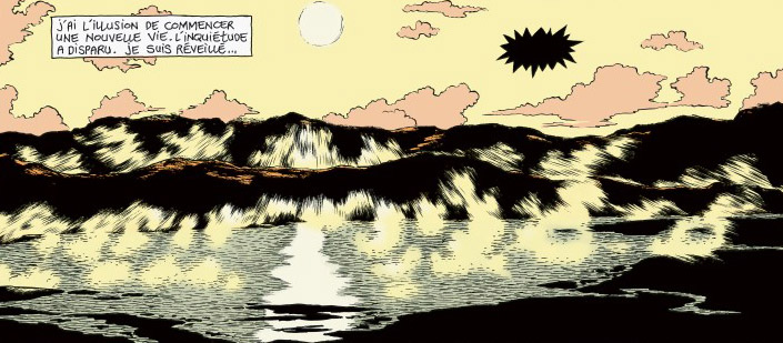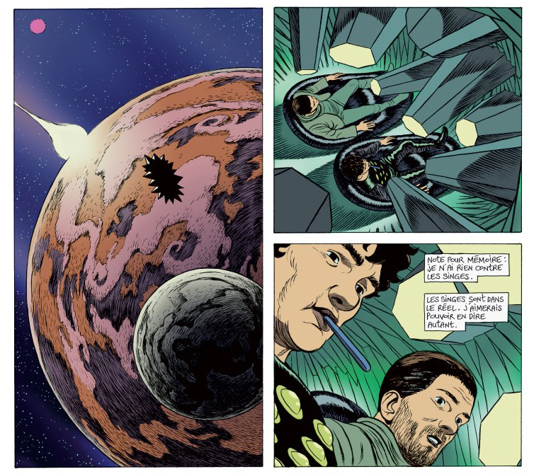 C’est avec plaisir que j’ai retrouvé l’univers unique de cet auteur que j’avais découvert avec Lupus, mélange de récit introspectif et de SF poétique. Mais cette fois, Frederik Peeters est passé à la couleur, et ça ne lui va pas si mal, même si la tonalité littéraire de l’histoire pouvait supporter largement le noir et blanc. Le trait a gagné en précision, mais se fait en même temps plus conventionnel. Un peu comme une version grand public de Lupus, avec les mêmes obsessions de l’auteur mais davantage en mode aventure : la perte de l’être aimé, la maladie silencieuse (le personnage principal Verloc est victime d’une maladie de peau, le lupus en est une également), la marginalité au sein d’un monde normatif et étouffant, les paradis artificiels, l’incommunicabilité, l’étrangeté du monde et la difficulté à trouver sa place dans l’univers.
