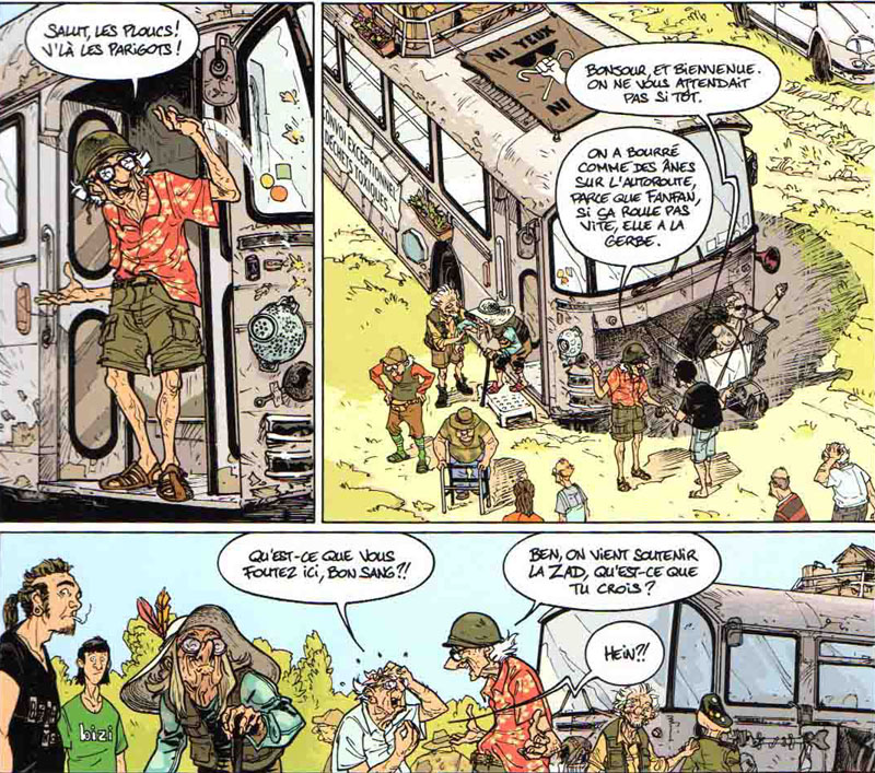 Grâce au talent des deux auteurs, Paul Cauuet pour le pinceau et Wilfrid Lupano pour la plume, le lecteur aura droit à quelques trouvailles, tant graphiques que scénaristiques. Comme toujours, l’histoire est émaillée de « punchlines » truculentes qui sont un peu la marque de fabrique de la série. Le trait franquinien reste toujours aussi alerte, à l’image de nos héros octos bouillonnants, dont le plus excentrique reste Pierrot, débarquant dans la ZAD telle un météore dans un vieil autobus bringuebalant, rempli de ses frères et sœurs d’armes, tous hauts en couleurs.