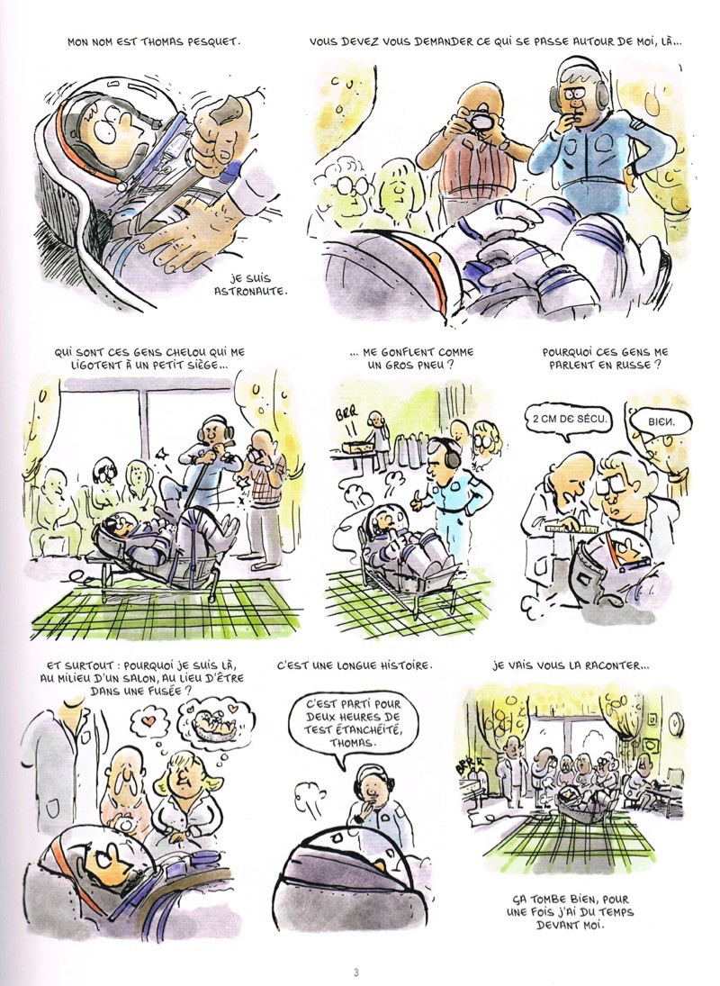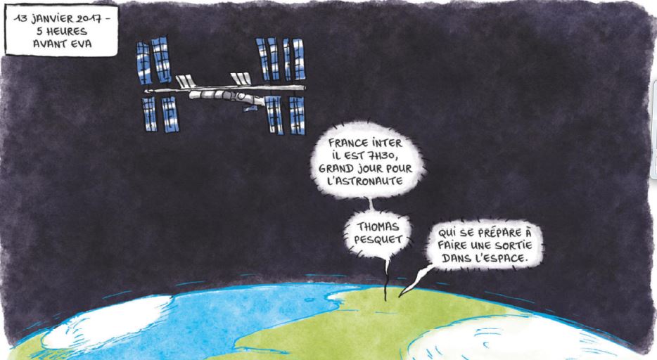 En occupant un créneau original, la BD de vulgarisation scientifique à l’humour décalé, Marion Montaigne est parvenue en moins d’une décennie à s’imposer dans le cercle restreint des bédéastes féminines les plus en vue. Aujourd’hui, cette hyperactive curieuse du monde qui l’entoure semble s’être installée pour longtemps sur l’orbite du succès. Il paraissait donc logique qu’elle s’intéresse aux pionniers de la conquête spatiale cantonnés pour l’heure à une autre orbite, celle de notre berceau la Terre… Ainsi, Montaigne a suivi pendant plusieurs mois le spationaute français qui vécut pendant six mois à bord de la Station spatiale internationale, j’ai nommé Thomas Pesquet. Celle qui apprécie, non sans malice, de se faire appeler « Professeur Moustache » a pu l’accompagner durant les phases de préparation et de réadaptation à la vie terrestre, et continuer à lui poser des questions lorsqu’il était dans l’espace.
