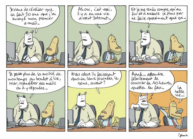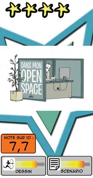 Ces sketches dotés d’un trait rond et minimaliste sont des inédits de la série Dans mon open space, dont quatre tomes sont déjà parus depuis 2008. Certes, ce n’est pas une virulente diatribe du système capitaliste, c’est beaucoup plus subtil que ça. On sourit volontiers et on rit aussi. Avec James, tout le monde en prend pour son grade, pas seulement le patron mais aussi ses employés, notamment certains râleurs dont les velléités de rébellion s’épanouissent devant la machine à café pour s’évanouir aussitôt quand le directeur passe par là par hasard. C’est donc un peu de nous-mêmes, avec nos petites lâchetés voire notre servilité face à la hiérarchie que l’auteur épingle ici. On n’est pas forcément fiers, mais qu’est-ce qu’on se marre…