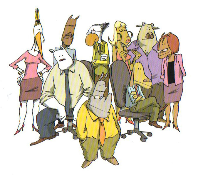 L’entreprise qui sert de cadre aux strips hilarants de James apparaîtra familière à beaucoup d’entre nous, de près ou de loin. Dans cette PME du textile à la croissance incertaine, on y trouve une édifiante galerie de personnages bien campés, à commencer par le directeur, Roland, infect avec son personnel mais suffisamment craint pour ne pas avoir à subir les grèves. Une caricature de PDG paternaliste, sachant à la fois jouer la connivence avec ses subalternes mais imperméable à toute demande d’augmentation, « car vous comprenez mon cher Pichon, les charges nous étouffent, et moi, à ce rythme-là, je mets la clé sous la porte dans trois mois », tandis que lui-même se rémunère grassement. Parmi les autres personnages évoluant dans ce microcosme quelque peu routinier, il y a le gratte-papier geignard mais docile, le commercial lymphatique et trop fainéant pour être vraiment vénal, l’autre commercial pur jus, toujours prêt à faire le beau devant son patron, ou encore le DRH désabusé aux ordres du boss.