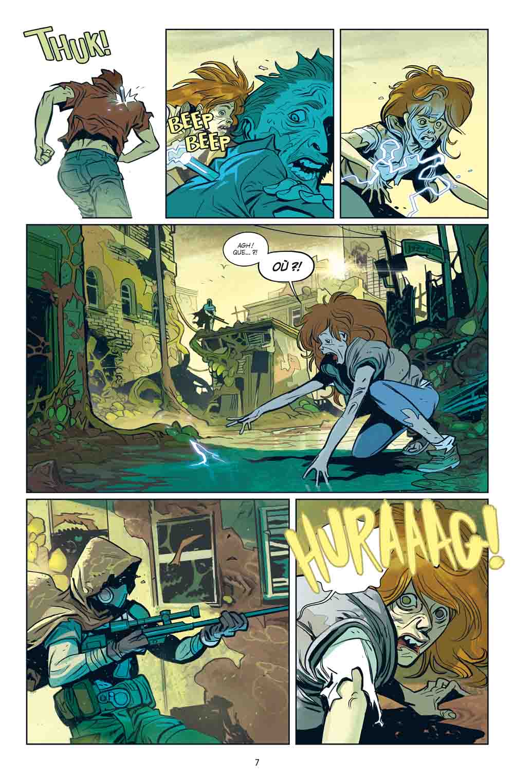 De même, ceux qui comme moi appréciaient la « lenteur » de Walking Dead risquent de souffrir de la mise en page nerveuse et peu fluide réservée aux scènes d’action, potentiellement source de confusion. Quant à l’Italien Lorenzo De Felici, il remplit parfaitement le cahier des charges avec son dessin clairement orienté « comics ». Propre et sans bavure, à la limite presque trop lisse, il colle au spectaculaire caractérisant l’histoire, mais ne se distingue guère du style en vigueur pour le genre. Toutefois, un des points positifs, et le plus troublant aussi, qui du coup ancre le récit dans notre début de siècle, est un personnage de femme : la compagne d’Ed (le frère de Nathan), d’apparence masculine, plus baraquée que ce dernier si bien qu’elle lui sert aussi de garde du corps !