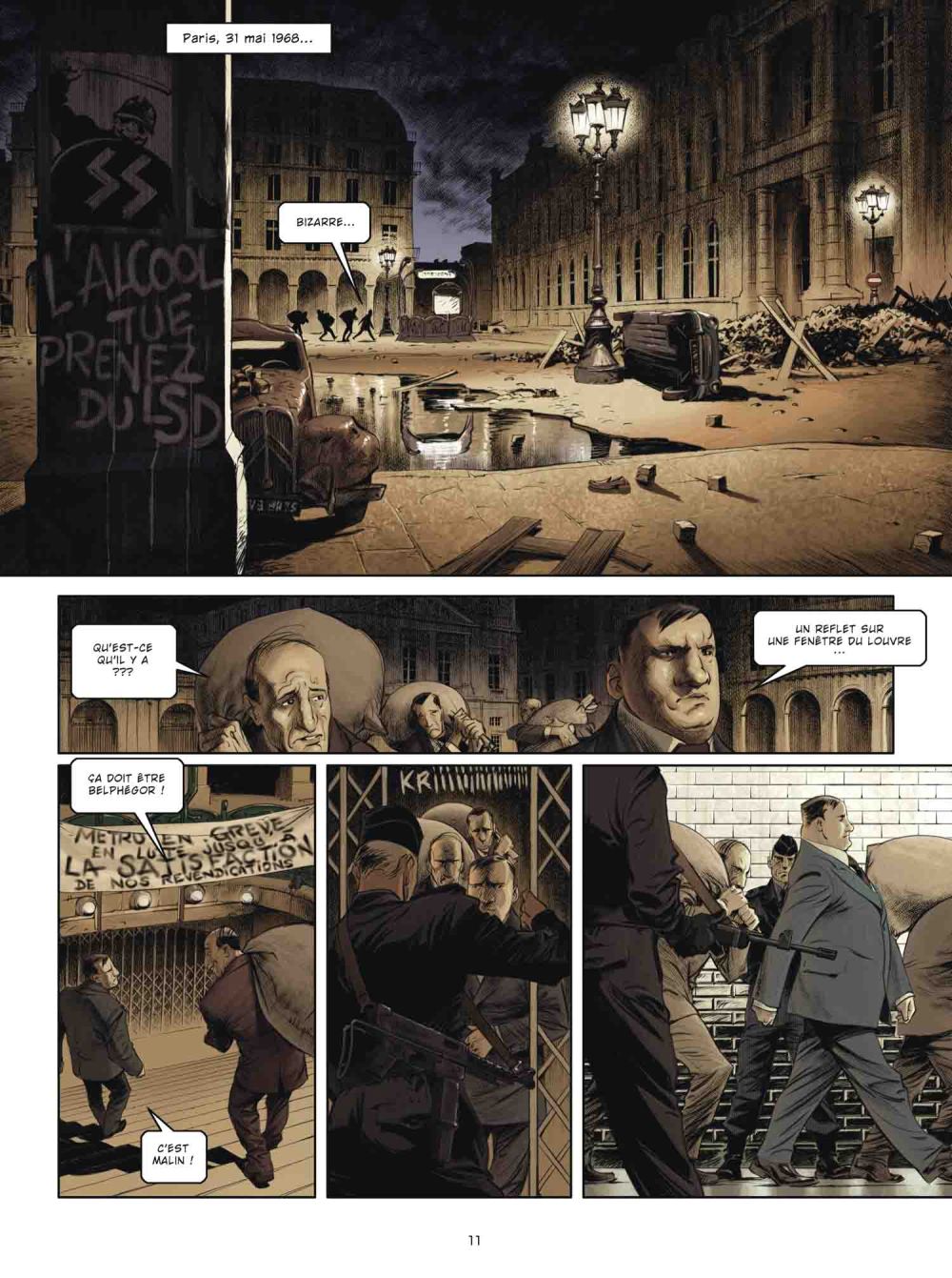 Toute l’histoire va tourner autour de ce « trésor » mystérieusement disparu, dans un contexte de paix fragile et de guerre des factions, de machinations politiques et de fantaisies architecturales psychédéliques. L’idée est pour le moins étonnante, en tout cas amusante, de voir comment la situation aurait évolué si la « chienlit » (expression si chère aux réactionnaires de l’époque) s’était organisée pour prendre les manettes du pays, avec un Paris meurtri par la guerre civile et envahi de constructions douteuses qui lui font ressembler à une fête foraine hippie. Cela n’est toutefois guère réaliste, et on imagine mal Daniel Cohn-Bendit et Serge July occuper les plus hautes fonctions de l’Etat dans un décor de SF d’opérette. Sous certains aspects, c’est assez grinçant, dommage que le scénario semble se disperser au risque d’une certaine confusion. Mr Fab quant à lui fait le job en produisant un dessin conventionnel mais léché, avec une plaisante reconstitution des seventies uchronisées.
