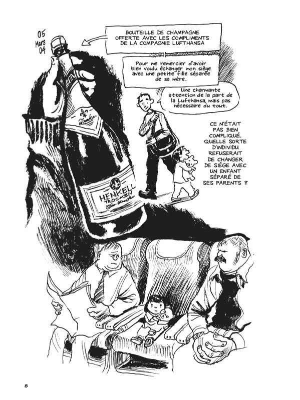 La particularité de ce récit est qu’il révèle davantage l’homme avec ses faiblesses qu’avec ses forces, empreint d’une autodérision freinant toute velléité d’auto-apitoiement. Le dessin l’accompagne à merveille, rendant hommage avec finesse à la beauté du monde, ainsi qu’à la gente féminine avec de jolis portraits. Son pinceau fluide et gracieux est un plaisir des yeux, exprimant toujours le mouvement même dans des représentations figées, avec un sens du détail révélant chez son auteur une curiosité innée.