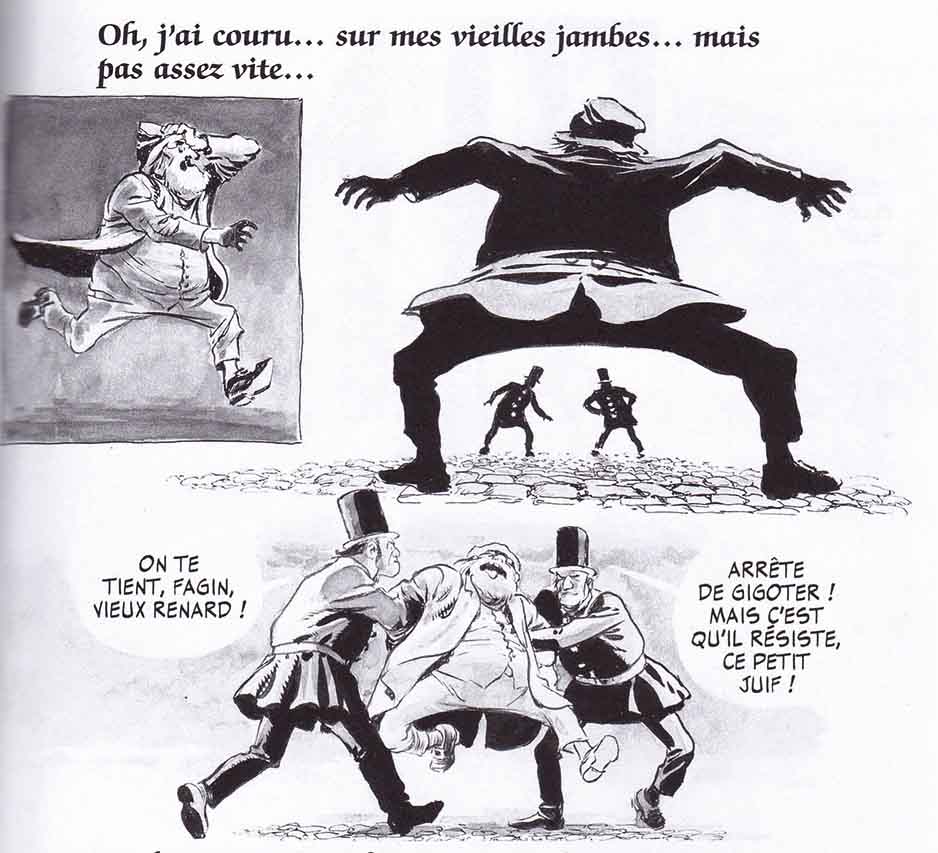 On comprend l’agacement de Will Eisner en consultant ces illustrations du XVIIIe et XIXe siècles reproduites à la fin du livre, tout à fait conformes à l’odieuse propagande hitlérienne mais peu dérangeantes avant la Shoah. Bien que vivant sur le sol européen, les Juifs y sont systématiquement dépeints avec des traits sémites, le corps vouté et la mine patibulaire, ayant toujours l’air de manigancer une affaire juteuse, tandis que les « Européens » ont fière posture, sont dotés d’un visage rond et un nez fin. A cet égard, Eisner nous prodigue un petit cours judicieux sur l’histoire du judaïsme en Angleterre, rappelant que les premiers Juifs venus dans ce pays étaient séfarades et, ayant dû fuir l’Inquisition en Espagne et au Portugal, purent s’assimiler sans mal à la faveur d’un commerce florissant. A l’inverse, les Ashkénazes, chassés par les pogroms d’Allemagne et d’Europe de l’est, n’arrivèrent que beaucoup plus tard (au XVIIIe). Si leur physionomie pouvaient les faire passer inaperçus dans la population, ils étaient en revanche appauvris et analphabètes, ce qui les confinait dans des quartiers sordides où ils devaient voler pour survivre. Pour Dickens, Moses Fagin ne pouvait être qu’ashkénaze, donc loin du portrait qui en a été fait dans Oliver Twist, et c’est ainsi qu’il l’a représenté dans sa bande.