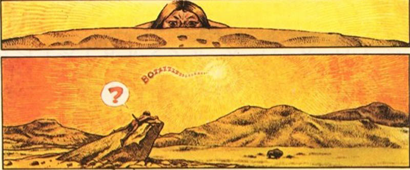 e ne pense pas que cet album soit le meilleur moyen de découvrir l’œuvre de Moebius – alias Jean Giraud – en tout cas d’être conquis. Je suis pour ma part resté un peu sur ma faim, et même si The Long Tomorrow, la plus longue et la plus consistante de ces histoires, est digne d’intérêt, avec l’assez rigolo L’Homme est-il bon ?, l’ensemble reste un peu superficiel et daté, tant sur le plan du dessin que de la narration. Et puis ces couleurs criardes… En même temps, comme pour toute forme d’art, je comprends qu’il ait fallu passer par là pour en arriver où nous sommes aujourd’hui. Depuis, il est vrai que les techniques des bédéastes se sont sophistiquées, mais de cette compilation émane le joyeux esprit créatif un peu foutraque qui découlait de mai 68. Même si à travers ces nouvelles l’auteur ne se révèle pas très optimiste envers le genre humain, il ressort quelque chose d’un peu naïf, comme une sorte de miroir sombre du mouvement hippie déjà sur le déclin à l’époque. J’imagine aussi que dans ces années-là, les univers délirants de Moebius devaient apparaître très innovateurs.