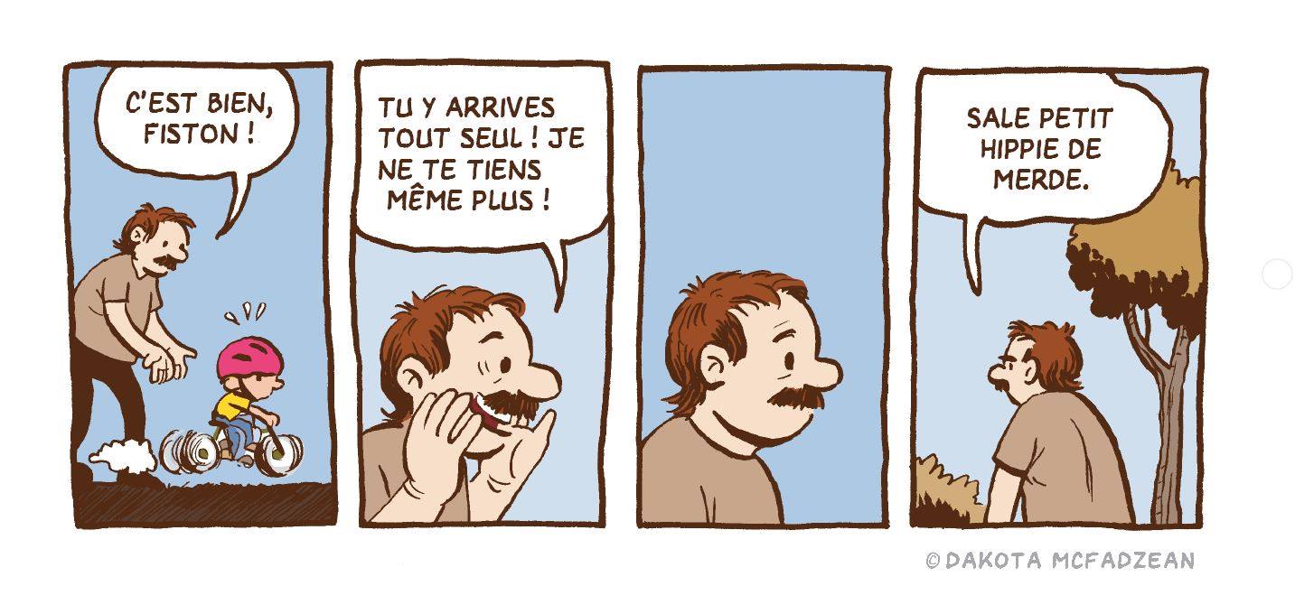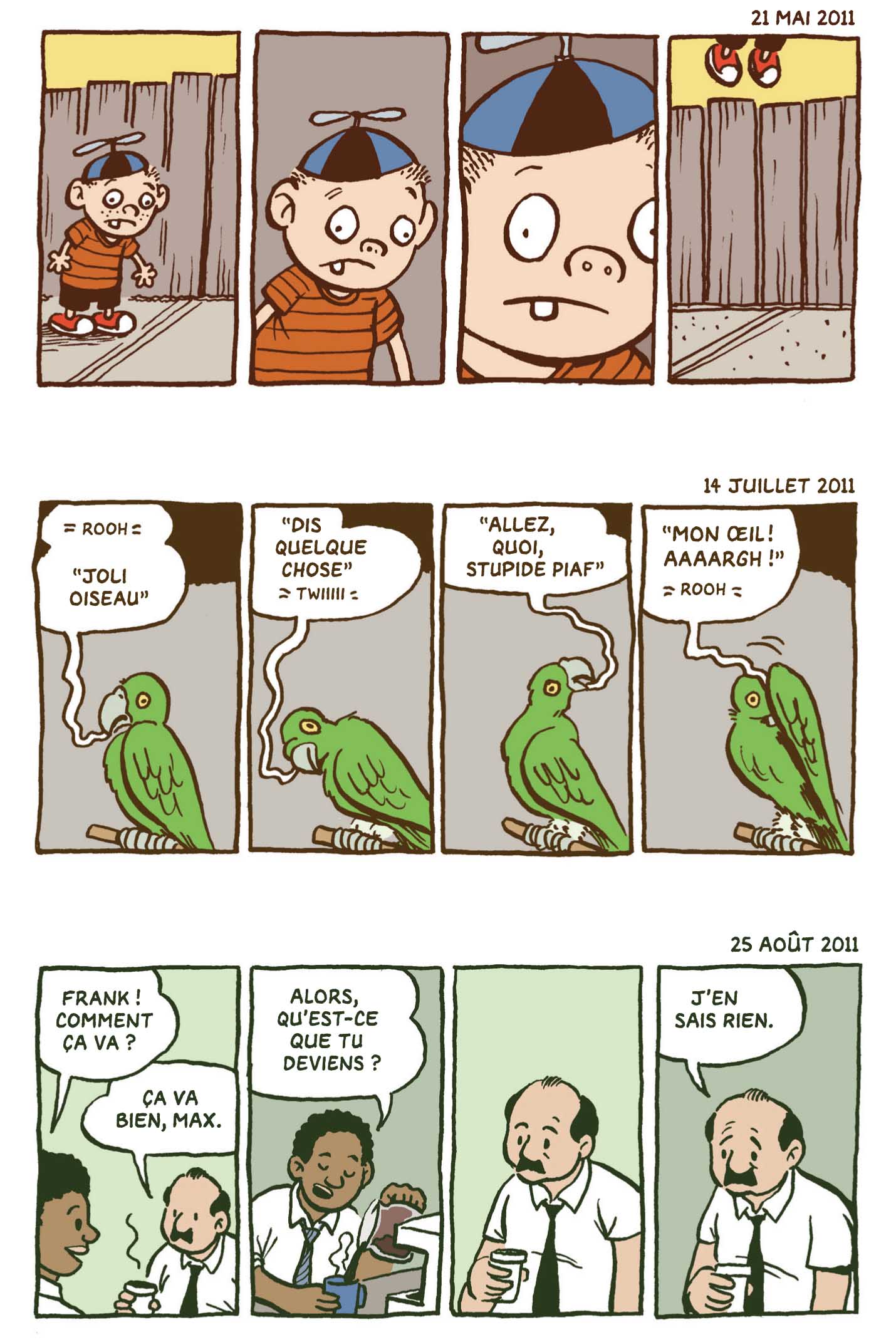 Est-ce cette absurdité totalement décalée qui engendre un effet de fascination unique, faisant que bien malgré soi, on finit par adhérer à ce drôle d’univers ? Ainsi, on se surprend à s’esclaffer devant l’audace de ces strips aux chutes totalement déphasées, mélange de poésie et d’humour noir. Et l’air de rien, Dakota McFadzean impose au fil des pages son univers néo-dadaïste doté d’une mécanique qui lui est propre et qui fonctionne parfaitement, à condition d’en déchiffrer le mot de passe d’accès.