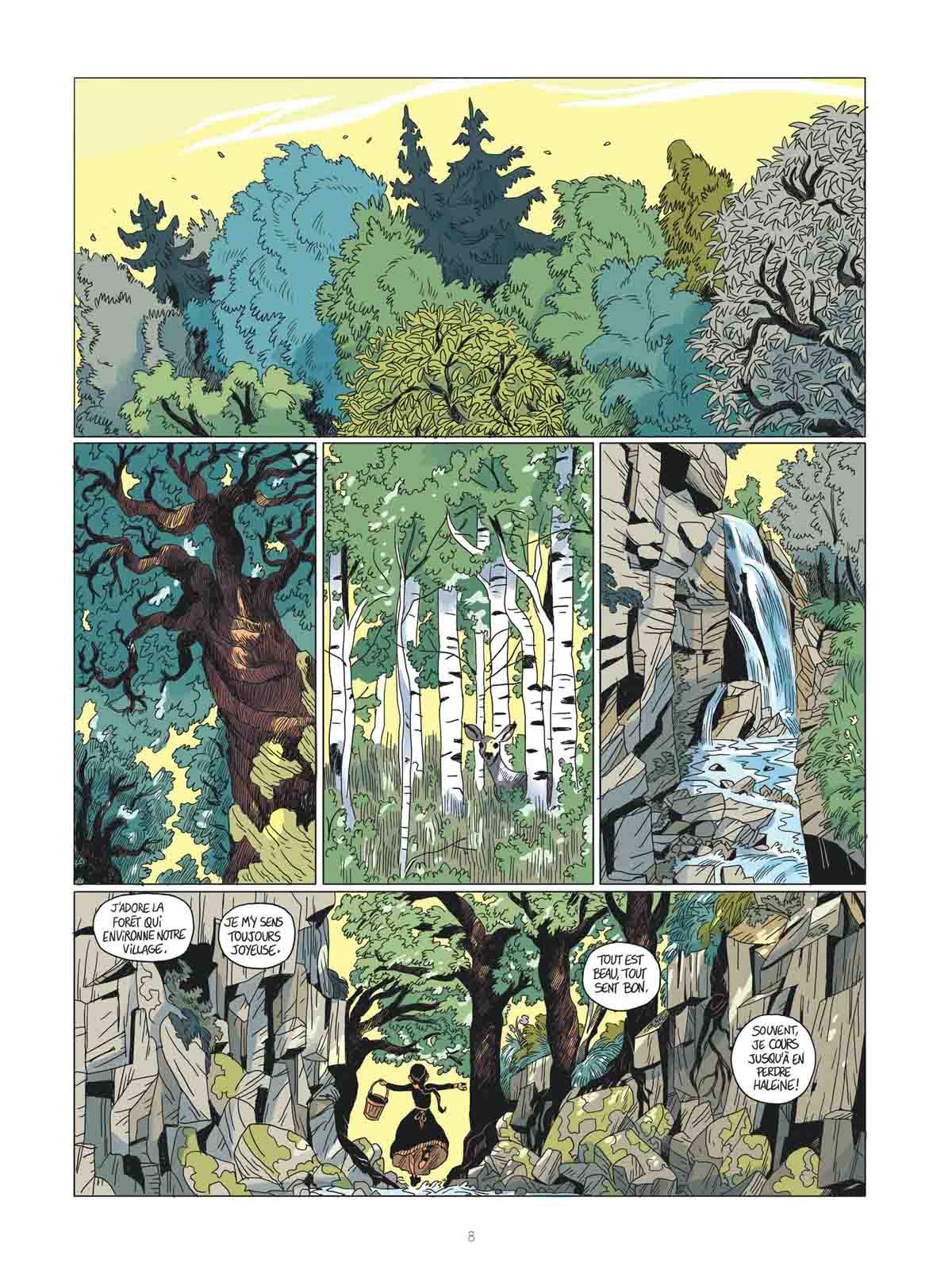 Thomas Gilbert a mis en images son histoire de façon saisissante. Au fil des pages, la tension se fait de plus en plus palpable, contrastant avec les scènes du début tout en poésie légère où l’on voit danser Abigail avec son nouvel ami indien au beau milieu d’une nature luxuriante, lumineuse et protectrice. Mais à partir du moment où les choses se gâtent, le trait laisse progressivement ressortir ses aspérités et c’est alors qu’apparaissent des images « subliminales » tirées d’enluminures religieuses représentant des créatures sataniques. Alors que les couleurs s’assombrissent peu à peu, il ne reste que le rouge des flammes pour éclairer l’obscurité, car à Salem, l’enfer est arrivé sur Terre…. Les visages, eux, se font plus grimaçants et haineux. Quant au révérend, son personnage d’inquisiteur autoproclamé apparaît comme le plus terrifiant, bien davantage que « L’homme en noir » et tous ceux qu’il accuse d’accointances avec le démon. Comme si d’une certaine manière, il était gêné par son propre reflet au cœur trop pur, lui-même étant vêtu de noir des pieds à la tête et non exempt de tout soupçon…
