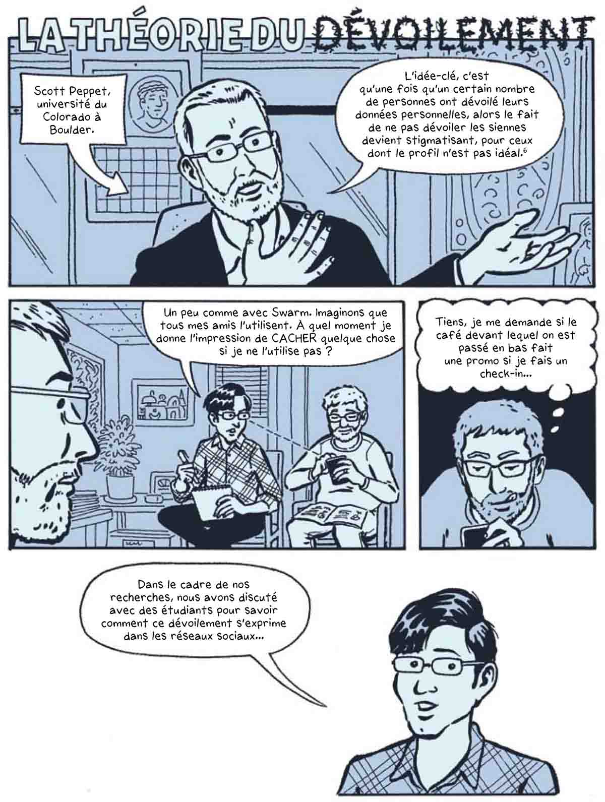 Josh Neufeld, co-auteur de La Machine à influencer donne à cette enquête dense et touffue un tour ludique par son style de dessin très proche de Scott McCloud. Le tout est passionnant et terrifiant à la fois. Une des solutions pour protéger sa vie privée selon un des experts interrogés : désactiver la géolocalisation sur son téléphone, ne pas être sur Facebook ! Que l’on soit disposé à le faire ou non, cette petite BD donne à réfléchir et fournit quelques pistes pour naviguer sur Internet avec plus de circonspection.