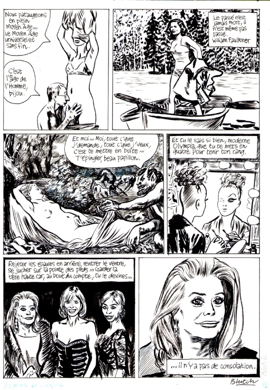 Cet album inclassable fournit à Blutch l’occasion de parcourir l’histoire du 7ème art, disséquant à l’aide de son trait acéré le modèle hollywoodien dans une tonalité très « nouvelle vague ». En quelques 80 pages, l’auteur s’interroge sur le rôle du cinéma et son rapport à l’art, et nous livre un constat amer et impitoyable : le cinéma est « la supercherie suprême, la bourgeoisie industrielle qui avance masquée ». Un piège tragique pour les acteurs qui sont conduits à livrer à tout le monde le spectacle de leur lente décrépitude malgré tous leurs efforts pour se farder et masquer les effets du temps…
