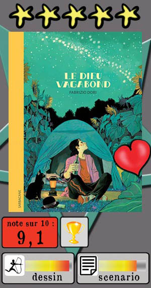 Le Dieu vagabond dégage une vraie beauté malgré quelques tout petits défauts – des regards pas toujours très expressifs par exemple ou des postures un peu balourdes, guère normées « BD » parce que sans doute, cela relève davantage de l’art pictural – Fabrizio expose dans des galeries de peinture… Mais ces « maladresses » sont d’autant plus touchantes qu’on a envie de les oublier, car qui dit œuvre poétique, dit albatros aux ailes trop grandes pour se mouvoir sur une Terre trop ferme, trop fermée. D’autant que le scénario est très bien construit, reste fluide, et que l’humour est aussi là pour empêcher à quiconque toute velléité de tomber dans le sérieux comme on tomberait dans le panneau.