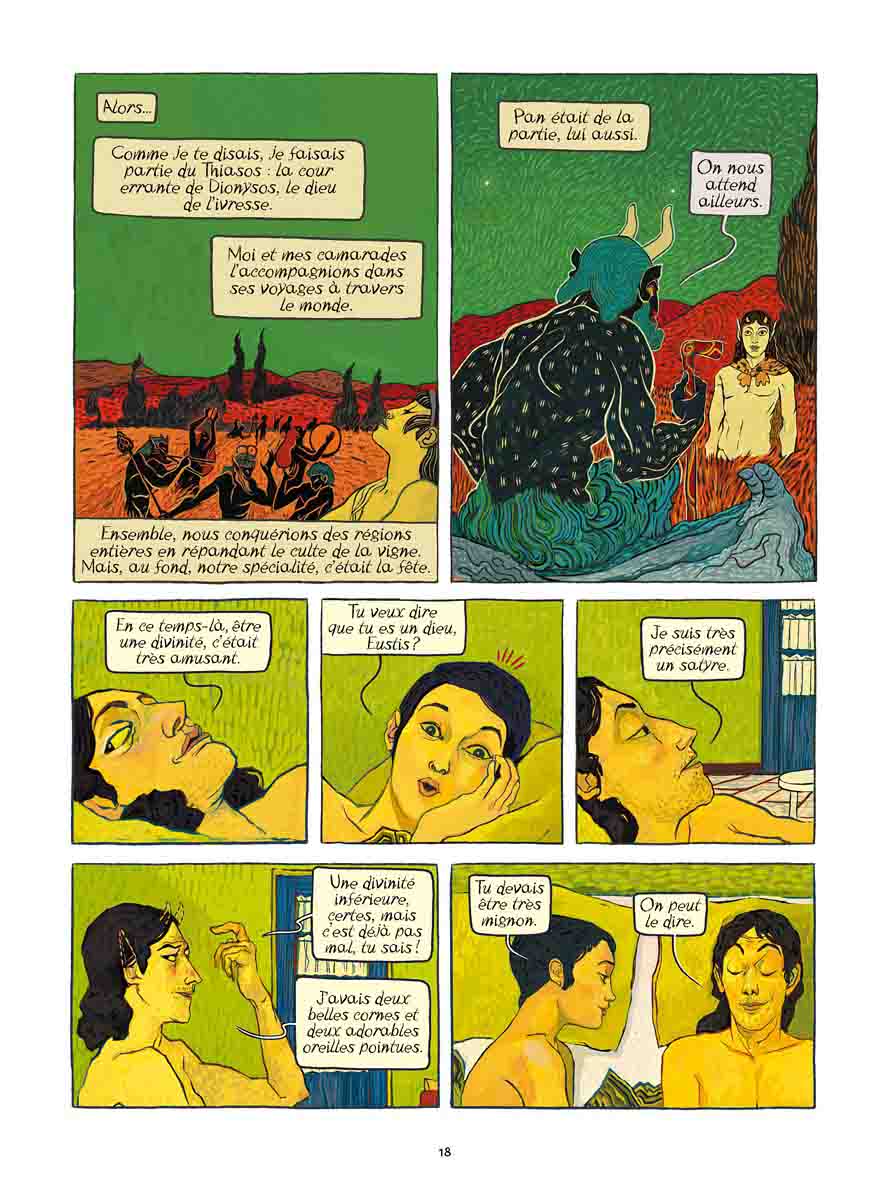 — Vous, les mortels, avez toujours l’esprit tourmenté. Si vous ne voyez pas les choses clairement, c’est parce que vous les recouvrez constamment d’une couche de paroles. Nous, les satyres, gardons la tête claire, solidement attachée au corps, et le corps bien ancré dans la terre. Le monde s’offre à nous spontanément !