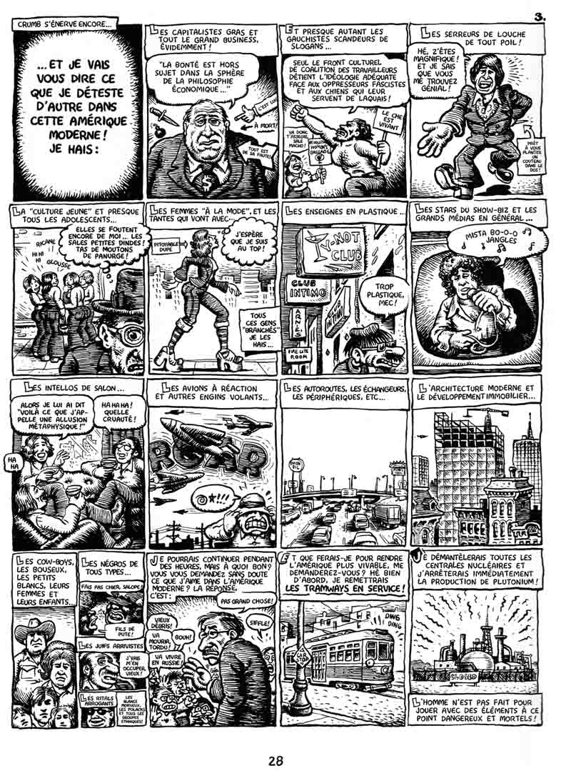 Pourtant, quelque chose m’a vraiment gêné dans cet exercice de US bashing. Deux histoires en particulier, When the Niggers Take Over America et When the Goddamn Jews Take Over America, pour lesquelles je vous passe la traduction. Crumb joue les oiseaux de mauvais augure, prédisant un avenir terrifiant pour l’Amérique, imaginant une prise de pouvoir des plus barbares par les Noirs, et ne se révèle guère plus amène avec les Juifs, en utilisant les pires clichés rednecks. L’éditeur a beau expliquer en annexe que « Crumb tape là où ça fait mal, et parie sans le dire sur une réaction de rire et de rejet de l’abjection », le fait de savoir qu’un groupuscule néonazi américain l’ait pris pour argent comptant est extrêmement dérangeant. C’est bien ça, le problème avec les écorchés vifs. Pensant qu’ils sont incompris, ils n’hésitent pas à pousser le bouchon très loin, dans une démarche quasi suicidaire. Le « vieux crouton râleur » ne se sent même plus tenu de se justifier, comptant sur l’intelligence de ses lecteurs, délivrant cette chose déplaisante qu’on suppose motivée par une colère froide, comme s’il était aux commandes d’un bombardier atomique. Encore heureux que l’éditeur soit intervenu pour relativiser le propos.