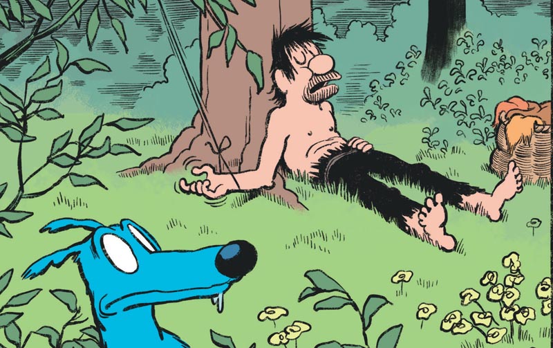 L’histoire quant à elle est totalement raccord avec cette couverture. Originale, fascinante, insolite, drôle et surprenante, elle semble avoir été conçue à l’instinct, ce qui au regard de la thématique paraît assez logique. D’emblée, les pages se tournent sans que ne pointe l’ennui, tant le lecteur est intrigué par ce drôle de récit, quasi expérimental, et la raison n’est pas seulement liée au fait qu’il n’y ait pas de textes. Hormis d’obscures tentatives oubapéennes révélant une certaine prétention élitiste dénuée d’humour, Trap ne doit pas avoir beaucoup d’équivalents dans le neuvième art. C’est ainsi que l’on observe ce drôle d’humain à gros nez évoluer dans ce monde primitif. Muni d’un sac renfermant des masques de bêtes qui lui confèrent les pouvoirs de l’animal dès lors qu’il les met sur la tête, notre homme, accompagné d’un chien bleu à l’aura à peine plus impressionnante que celle de Rantanplan, se fait super-héros préhistorique, et nous laisse la plupart du temps interloqué et amusé.