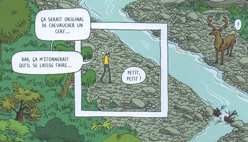 Cela fonctionne parfaitement et le lecteur prend un vrai plaisir à suivre l’histoire de ces deux cow-boys de pacotille, pas vraiment faits pour le job. Car heureusement, Farnos a la bonne idée d’employer sa technique avec modération, évitant d’en faire un gimmick systématique qui risquerait de lasser. Au contraire, il sait doser ses effets et ménager la surprise. Et c’est bien lorsqu’on réalise, sans forcément s’y attendre, que les cases s’ouvrent soudainement sur une vue panoramique, qu’on ressent une joie quasi enfantine… Et quoi de plus naturel de jouer avec l’espace quand l’histoire se déroule dans les grands « espaces » du Far West ? Du coup, ce n’est pas par hasard si les deux ouvrages précédents s’adressaient aux enfants, l’un deux, Thomas et Manon, se présentant d’ailleurs sous forme de livre-objet incluant des cartes à jouer, à l’aide desquelles le gosse prend part à l’histoire ! Ouvroir, vous avez dit « ouvroir » ?
