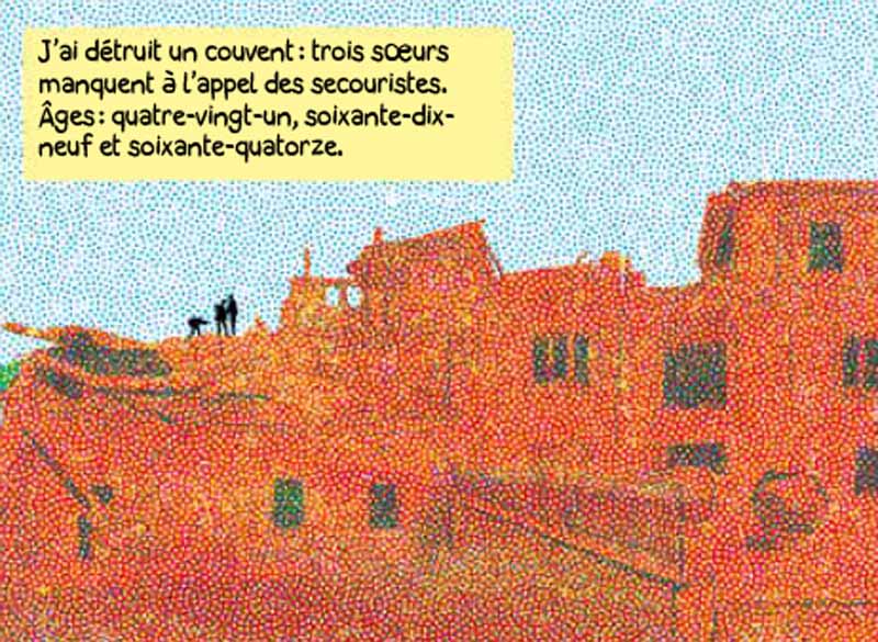 À la lecture de ce petit album énigmatique, peut-on déduire qu’un tremblement de terre est le résultat d’une action humaine, si anodine apparaît-elle, l’action en question étant la mise à mort d’une « licorne », qui semble revêtir ici un symbole sacré ? Encore une fois, Giacomo Nanni n’explique rien, il expose des faits, suggère, sans jugement, nous laissant maître de tirer des conclusions comme bon nous semble… Plus une œuvre est dans la suggestion et le non-dit, plus il apparaît prétentieux d’en faire l’exégèse. Avec Acte de Dieu, l’auteur semble au moins nous inviter, nous humains, à la modestie face à la nature et la puissance des éléments. Son livre ne fait que résumer la lutte millénaire entre l’Homme et la nature, et de façon particulièrement troublante.