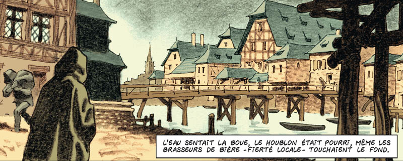 L’originalité de l’ouvrage tient plus dans la retranscription graphique que dans la narration en elle-même (celle-ci n’étant in fine qu’un compte-rendu chronologique de ce drôle de fait divers, si terrible soit-il), et pour cela, Richard Guérineau nous a déjà montré toute la créativité dont il était capable. La description de ces danseurs et danseuses qui semblent n’être que les pantins inoffensifs totalement sous le contrôle d’une puissance occulte, ramenés au rang de zombies désarticulés, donnent lieu à de longues scènes silencieuses à la fois comiques et saisissantes, que Rabelais, contemporain de l’époque où se déroule l’action, n’aurait pas reniées. Comme il sait très bien le faire, Guérineau joue beaucoup d’un point de vue visuel sur le décalage temporel avec quelques allusions furtives à notre époque, qui par exemple voient la place de la cathédrale strasbourgeoise se transformer en rave party échevelée et torride. A travers cette histoire vraie, l’auteur dénonce à sa manière l’initiative meurtrière et sanglante des autorités catholiques pour mettre fin à ces paillardises « impures »… Hasard du calendrier ou non, Strasbourg se convertit quelques années après la tragédie au protestantisme…