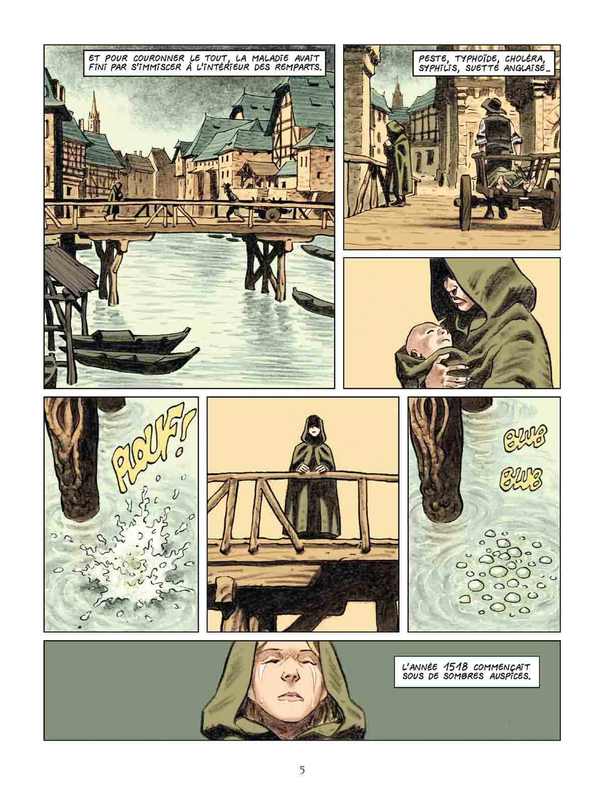 Pour la seconde fois, après l’excellent Charly 9, Richard Guérineau met en images un récit de Jean Teulé, qui décidément semble inspirer les auteurs de BD. Logique me direz-vous, quand on sait que celui-ci a fait ses premières armes en dessinant notamment pour l’Écho des savanes. Avec Entrez dans la danse, Guérineau parvient une nouvelle fois à nous rendre proche un chapitre de l’histoire de France, ici très méconnu, à l’aide de son trait semi-réaliste très vivant, qui du coup convient parfaitement à la thématique traitée : la danse. La particularité du fait divers narré ici réside dans son extrême rareté et dans le fait que personne n’a jamais pu fournir d’explication satisfaisante. Folie collective ? Virus ? Mauvaise conjonction des astres ? Conséquence de la famine qui sévissait à l’époque ? Les suppositions allaient bon train chez les médecins et les ecclésiastiques… Quoi qu’il en soit, la « danse de Saint-Guy » qui s’était emparée soudainement des Strasbourgeois a démontré comment une pratique aussi anodine qu’un simple déhanchement, certes collectif et prolongé, réussit à mettre aux abois les autorités, révélant tout ce qu’elle pouvait avoir de subversif. A l’époque, la ville alsacienne était évidemment sous le carcan de l’Église catholique. Celle-ci jugea avec sévérité le comportement des habitants, qui pourtant ne semblaient aucunement conscients de leurs actes. Comme saisis par une transe mystérieuse, ils se contentaient de danser comme si le monde autour d’eux n’existait plus.