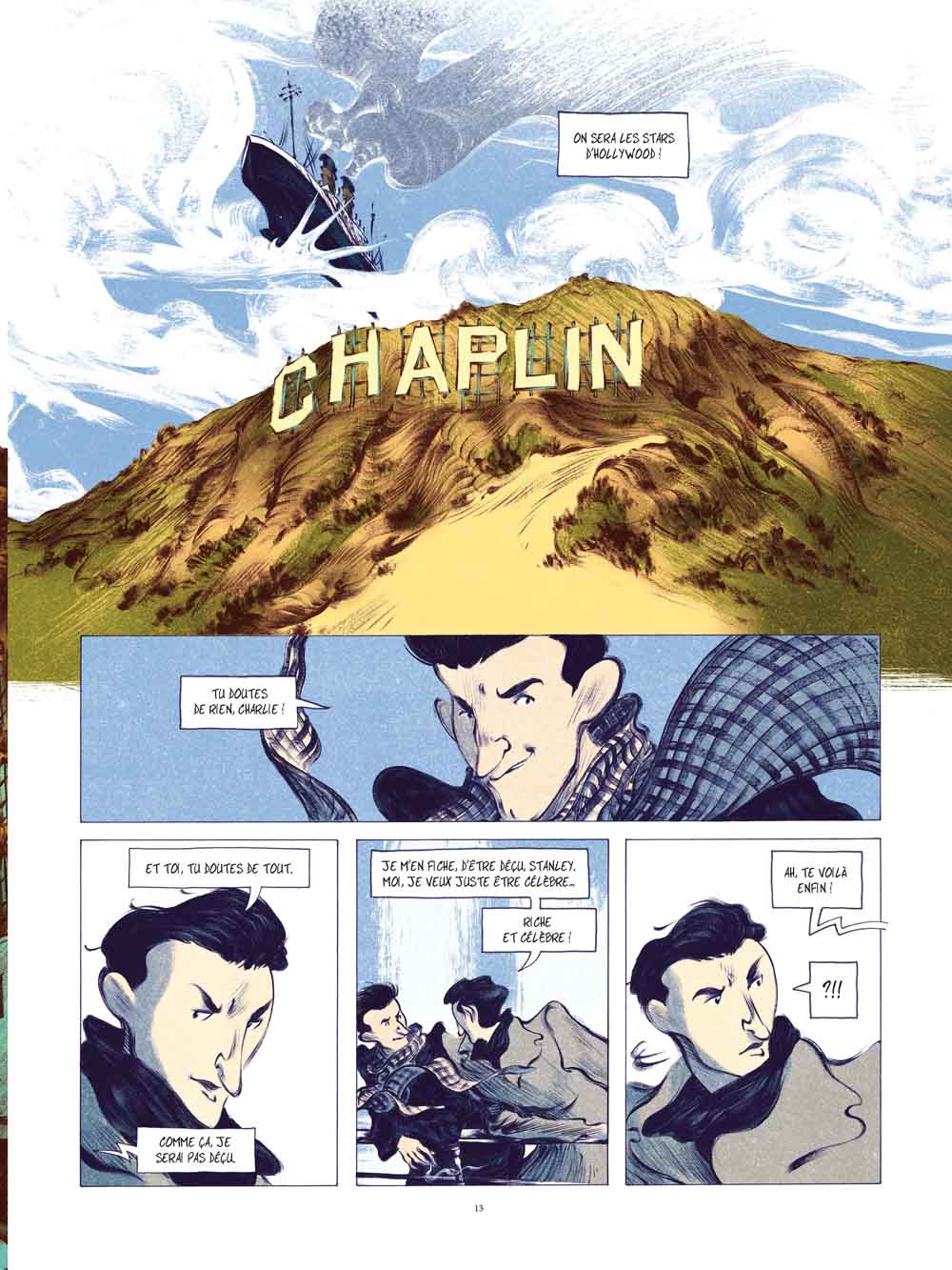 C’est donc David François qui s’est vu confié la mission de redonner vie en dessin à Sir Charles Spencer Chaplin. De façon presque logique, puisqu’à la lumière de sa bibliographie, le co-auteur (avec Régis Hautière) de De Briques et de sang et plus récemment du Vendangeur de Paname semble avoir un goût particulier pour la Belle époque. Son trait, tout en ondulations fantasques et dynamiques, possède une qualité un rien désuète tout à fait adaptée à un tel récit, que vient rehausser une colorisation soignée. Dans une mise en page plutôt créative, David François s’en donne à cœur joie pour dessiner les scènes muettes, souvent burlesques — avec un joli clin d’œil au futur Dictateur où l’on voit Charlot, croyant à un avenir plein de promesses, s’amuser avec une Lune-ballon sous la voûte étoilée. La représentation pleine page des vues urbaines est splendide, notamment celle, fantasmée, de l’arrivée à New York de Chaplin, ce qui permet de mesurer tout le talent de l’auteur. Ce qui fonctionne moins, en revanche, c’est la façon dont est présentée la star. Le lecteur pourra être surpris voire déconcerté de le voir sous les traits d’un jeune homme élancé au visage en lame de couteau, avec des petits yeux de renard, pas spécialement avenant en séducteur arrogant… Un décalage énorme avec l’image que l’on peut avoir de « notre Charlot », ce petit bonhomme attachant à l’allure cocasse, bloquant toute empathie pour ce dernier dans ses mauvaises passes. Un parti pris qui nuit à la crédibilité de l’histoire, si authentique soit-elle.